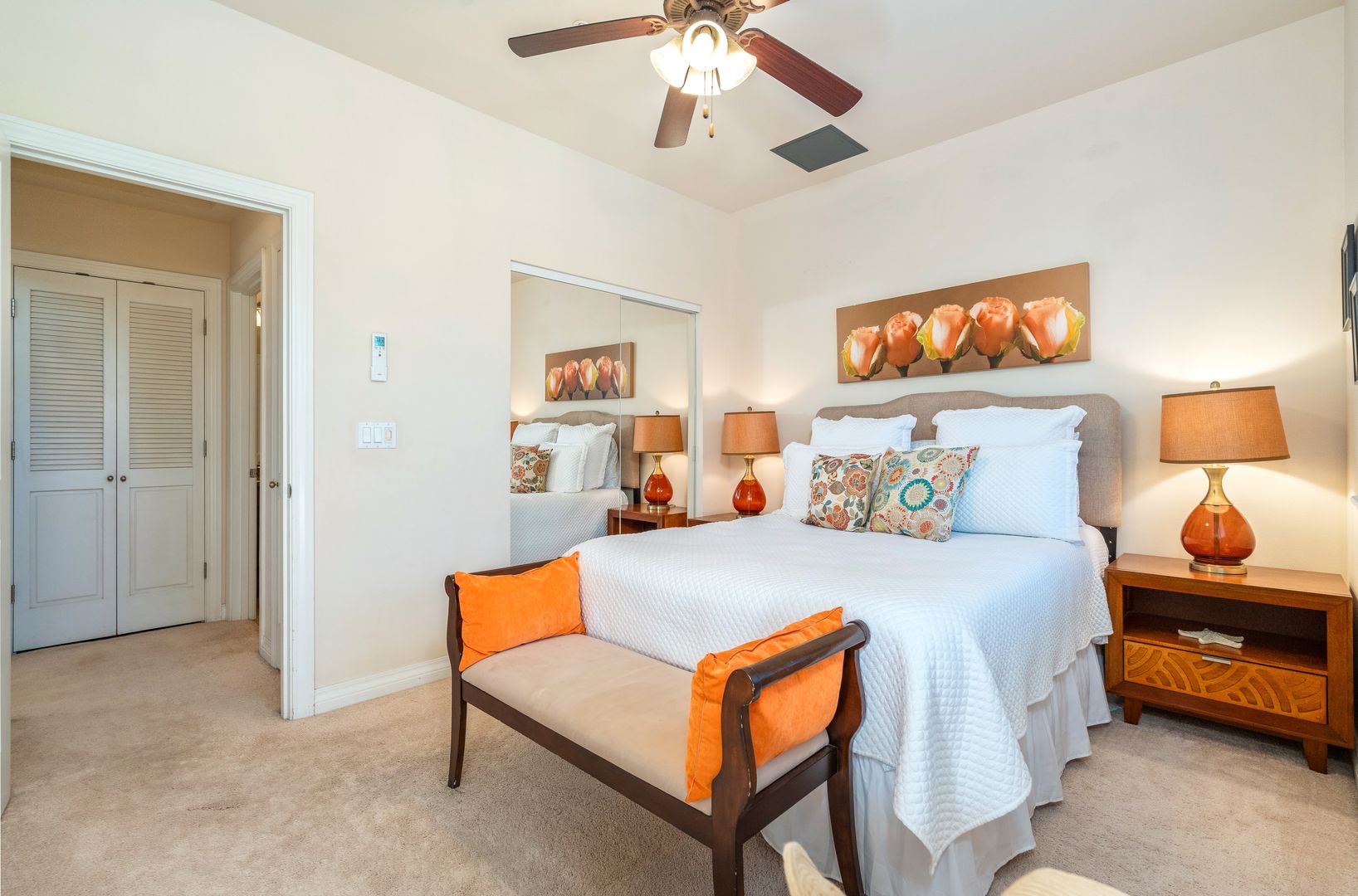 The three bedrooms have plush carpet throughout. The spacious primary bedroom with a luxurious CalKing size bed and a spacious closet, an ensuite bathroom has granite countertops and a luxury walk in shower. The second bedroom has a Queen size bed and a spacious closet. The second bathroom off the bedroom hallway offers granite countertops and bathtub/shower combo. The third bedroom upstairs has a full size bed and twin size bed that can be put together for a King size bed with a spacious closet.