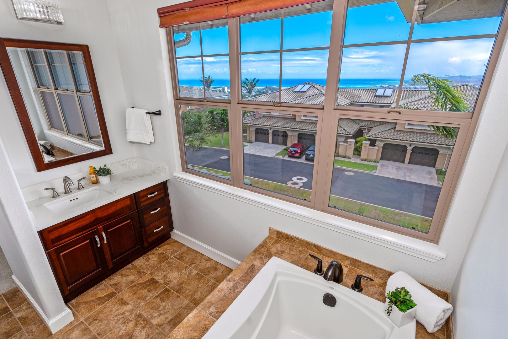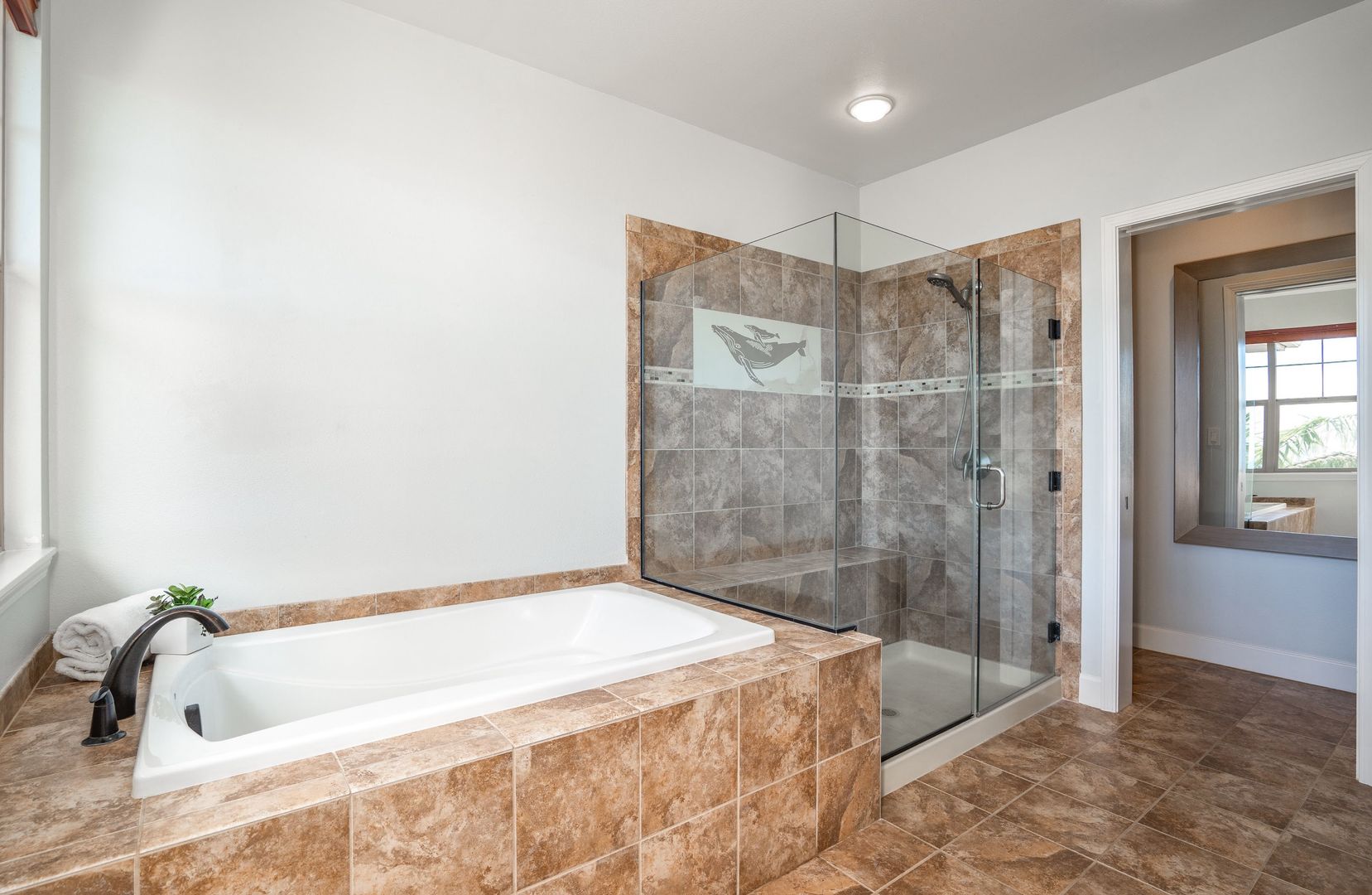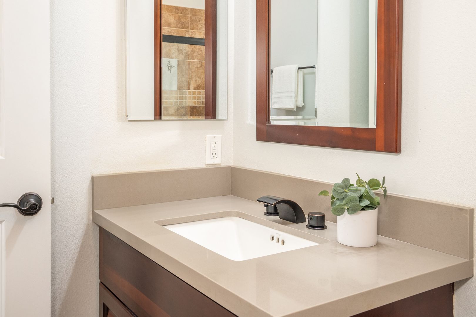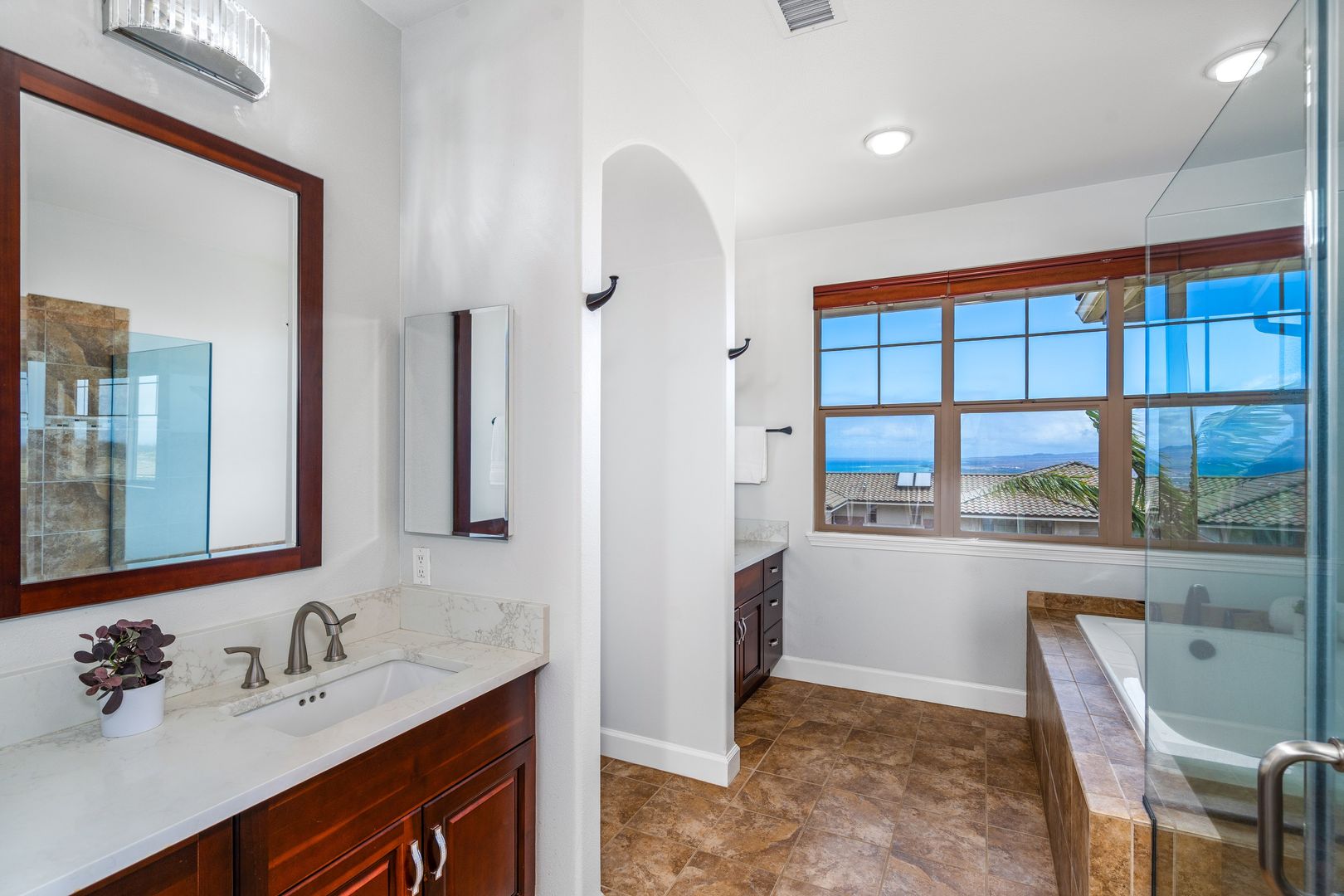 This unique floor plan features two bedrooms with plush carpet and both with ensuite bathrooms. The first primary bedroom showcases the ocean views with a spacious walk-in closet. The ensuite bathroom has a luxurious soaking tub, glass shower, and quartz custom dual sink vanity. The second bedroom has windows that open up to the beautiful tropical landscape and West Maui Mountains. The ensuite bathroom has a tub/shower combo, and a quartz custom sink vanity.