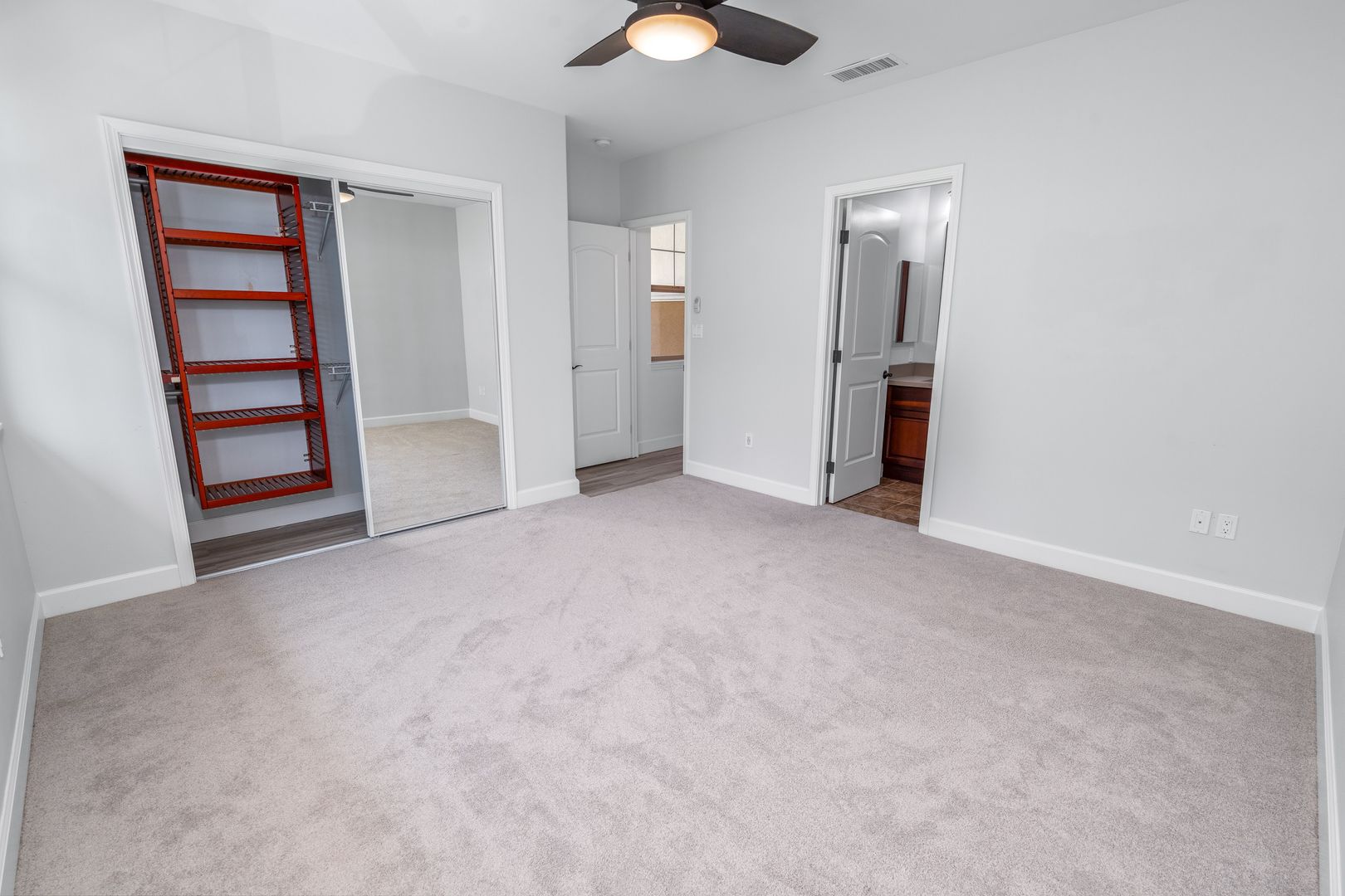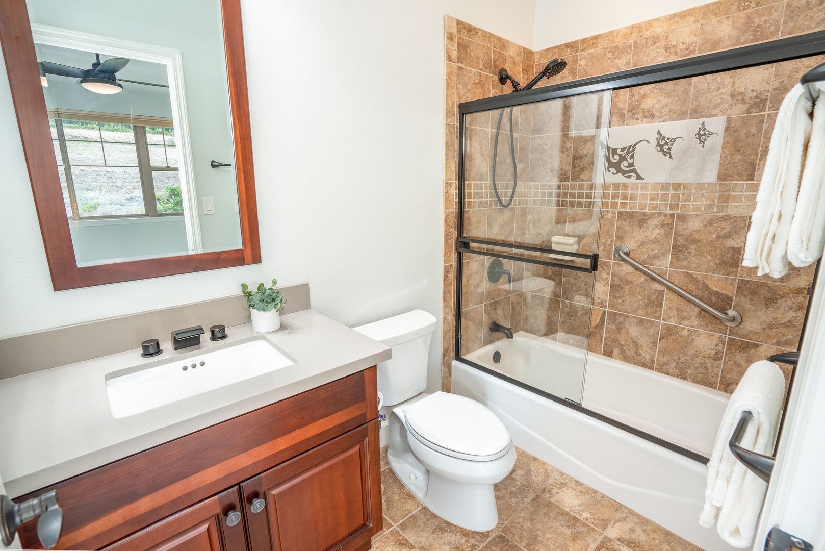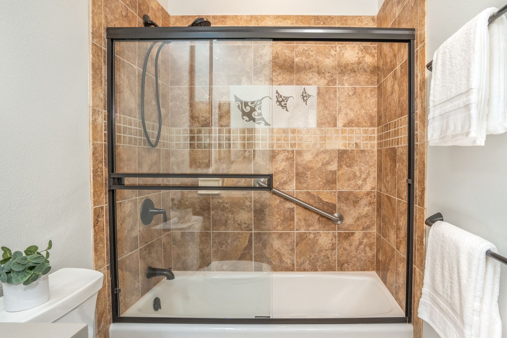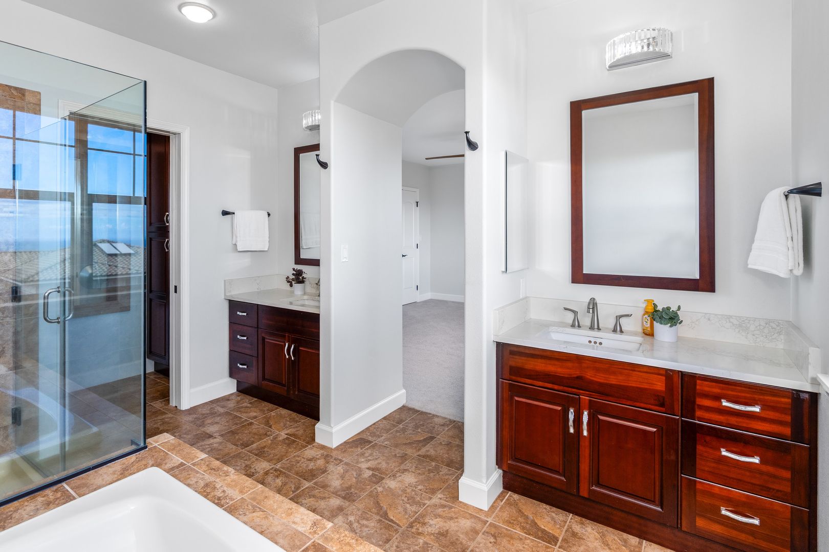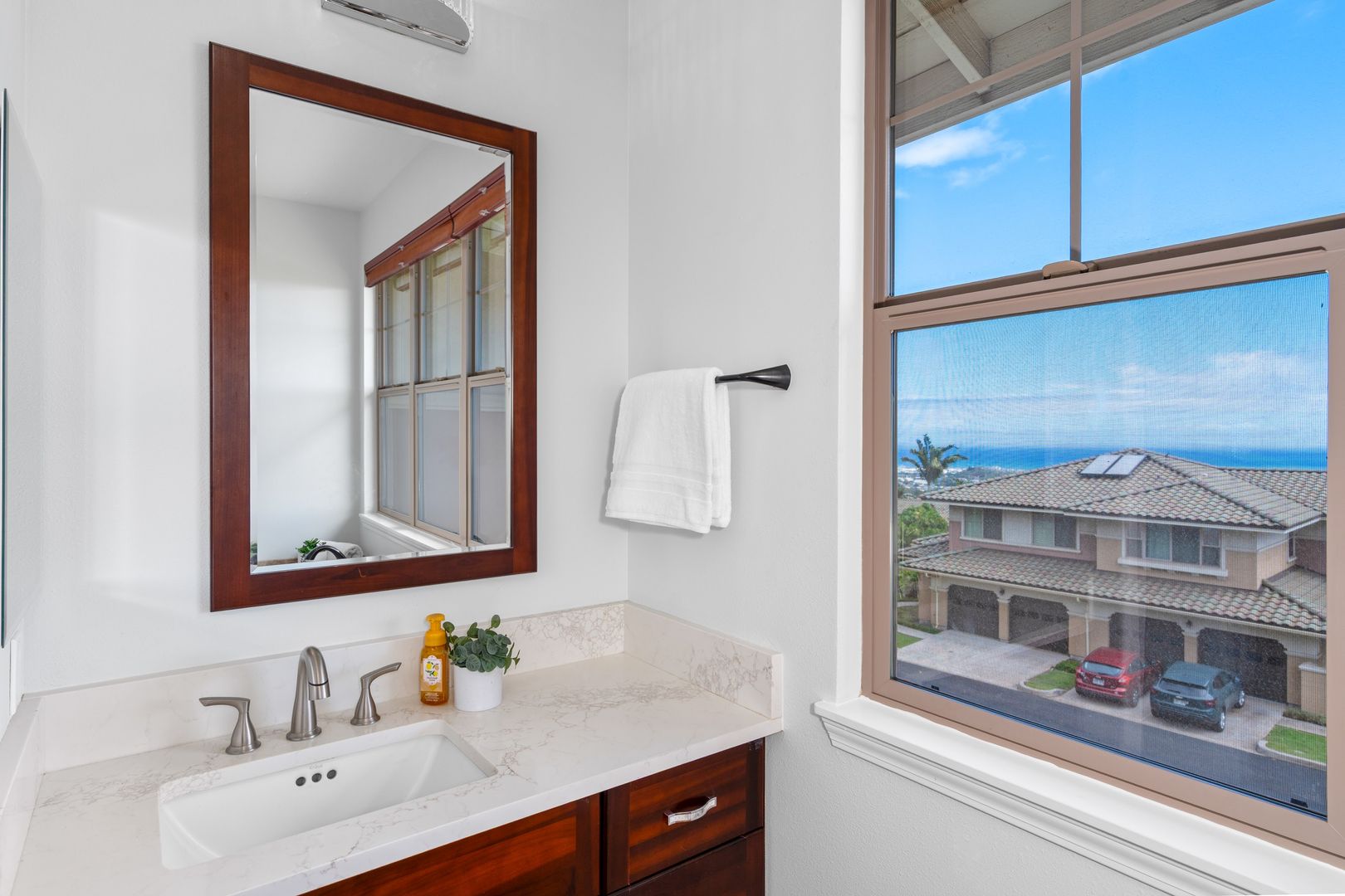 This unique floor plan features two bedrooms with plush carpet and both with ensuite bathrooms. The first primary bedroom showcases the ocean views with a spacious walk-in closet. The ensuite bathroom has a luxurious soaking tub, glass shower, and quartz custom dual sink vanity. The second bedroom has windows that open up to the beautiful tropical landscape and West Maui Mountains. The ensuite bathroom has a tub/shower combo, and a quartz custom sink vanity.