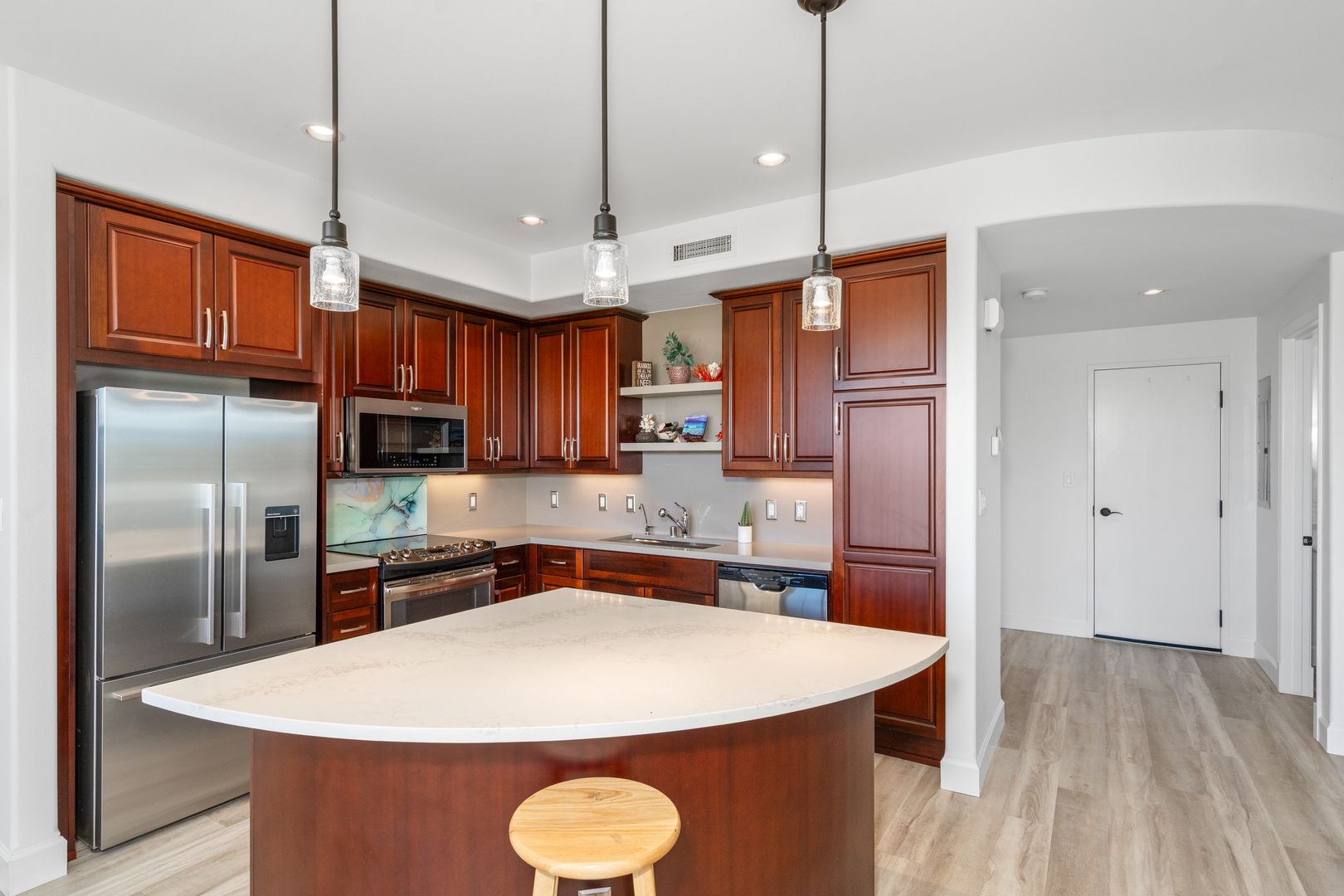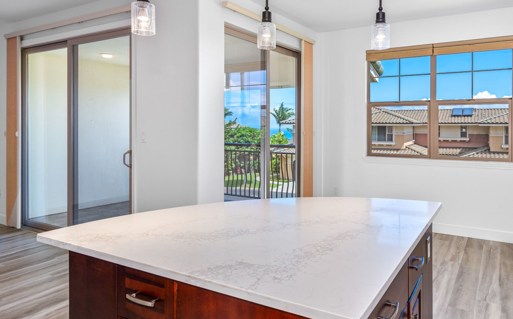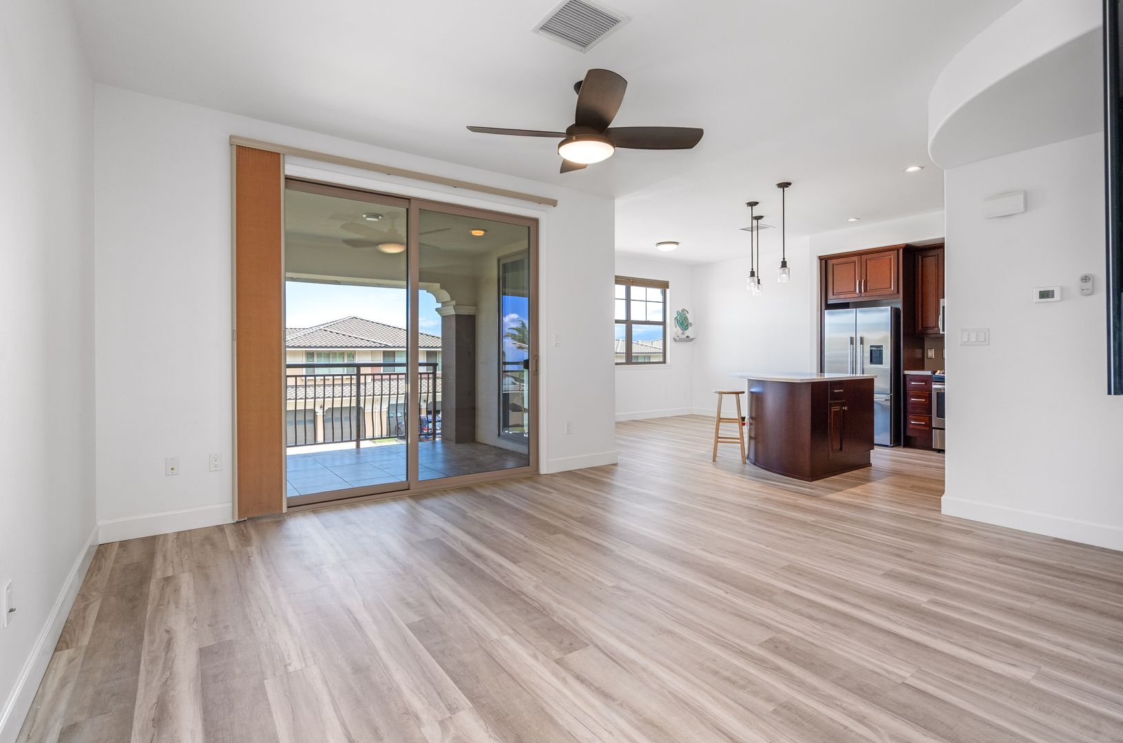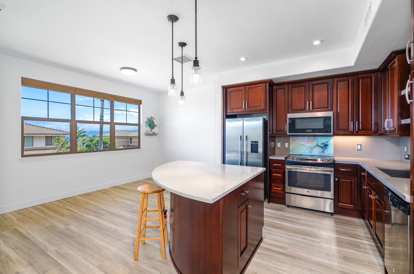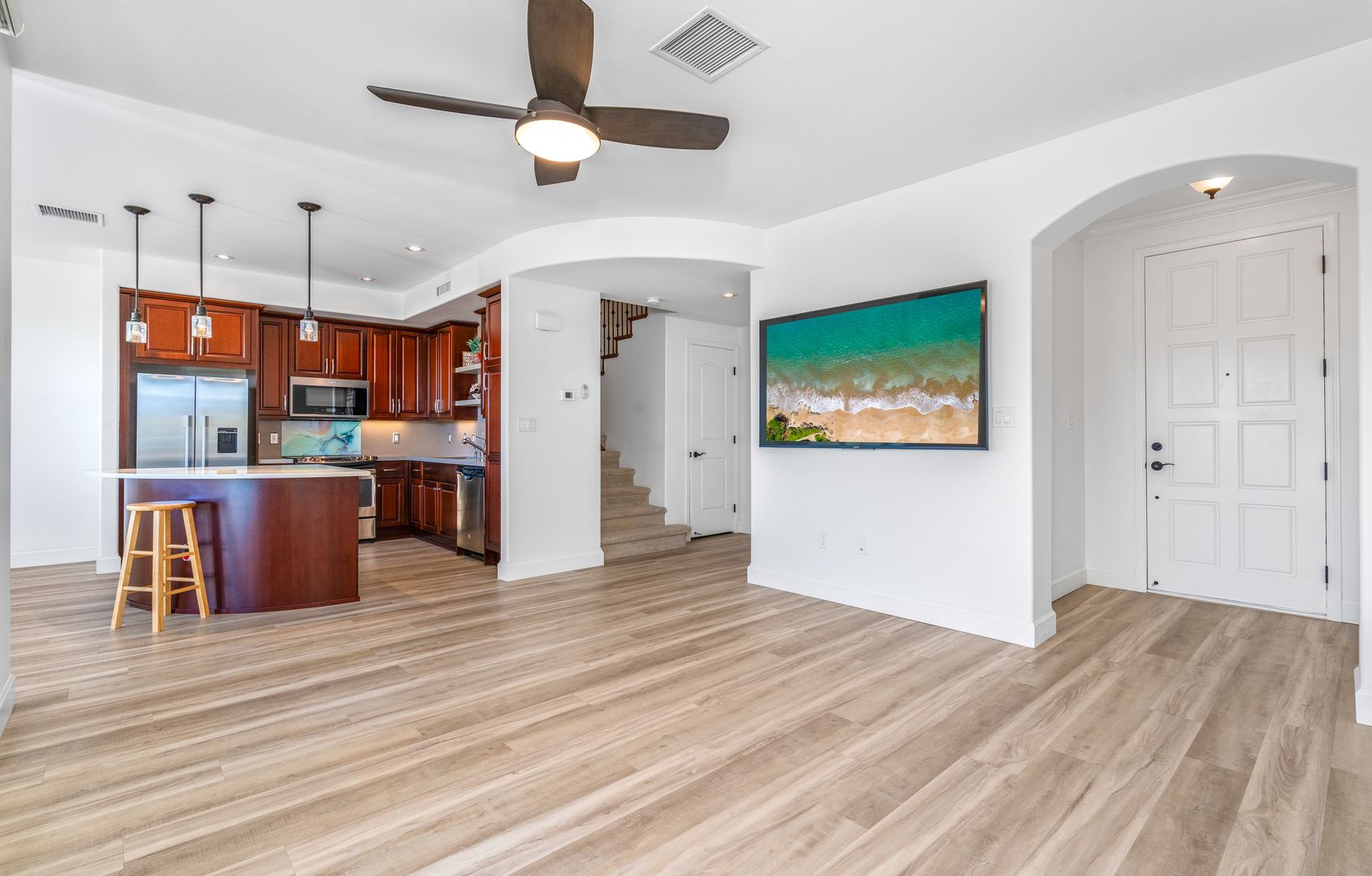 Beautifully appointed townhome with luxury laminate plank flooring throughout the spacious two-level floor plan with high ceilings, stylish ceiling fans, and custom window treatments. The living and dining area boasts an open floor plan to take in the ocean views with an indoor/outdoor area with the lanai sliding glass window to your private covered lanai! Relax in the living area and watch movies on the big-screen wall-mounted Smart T.V. The kitchen is equipped for the chef of the family and includes all the stainless steel appliances, including built in microwave and dishwasher, quartz countertops, with a Kitchen Island and plenty of cabinet space.