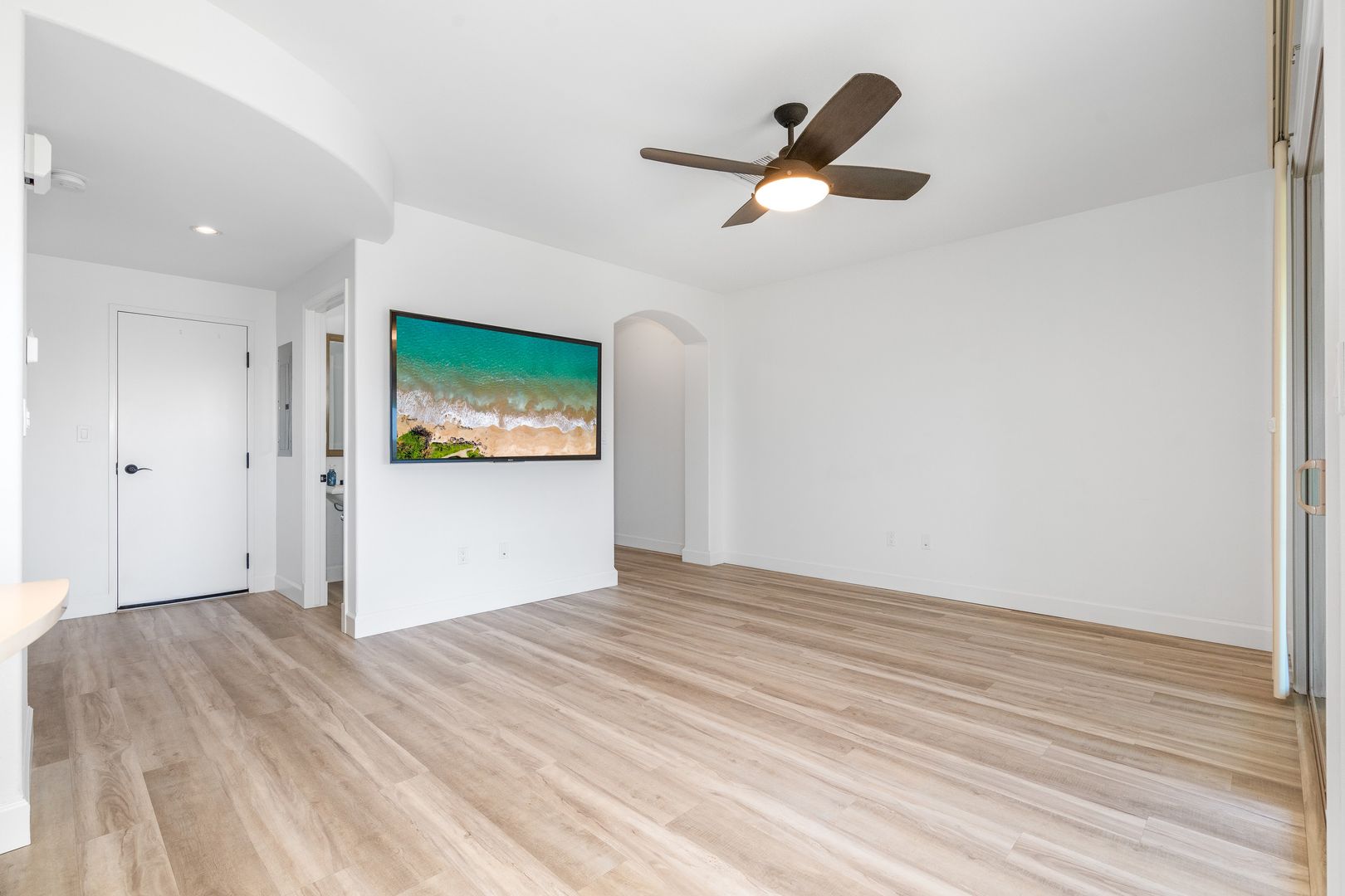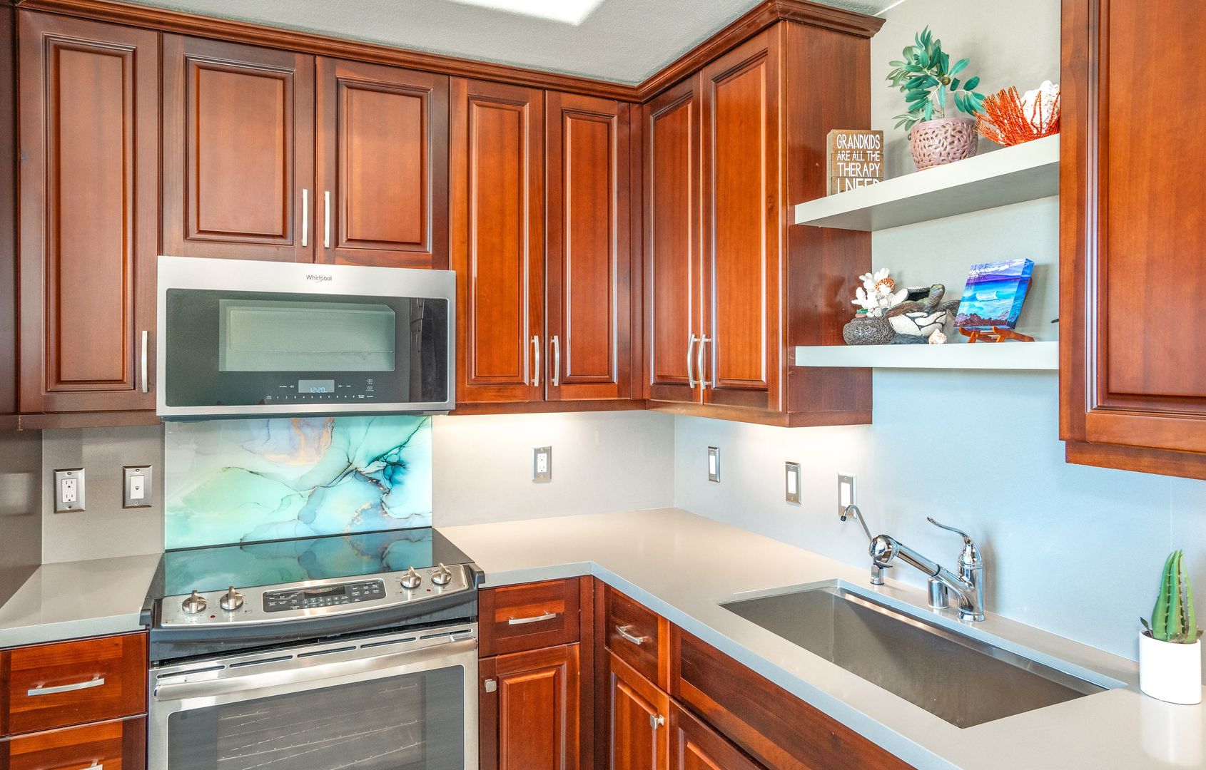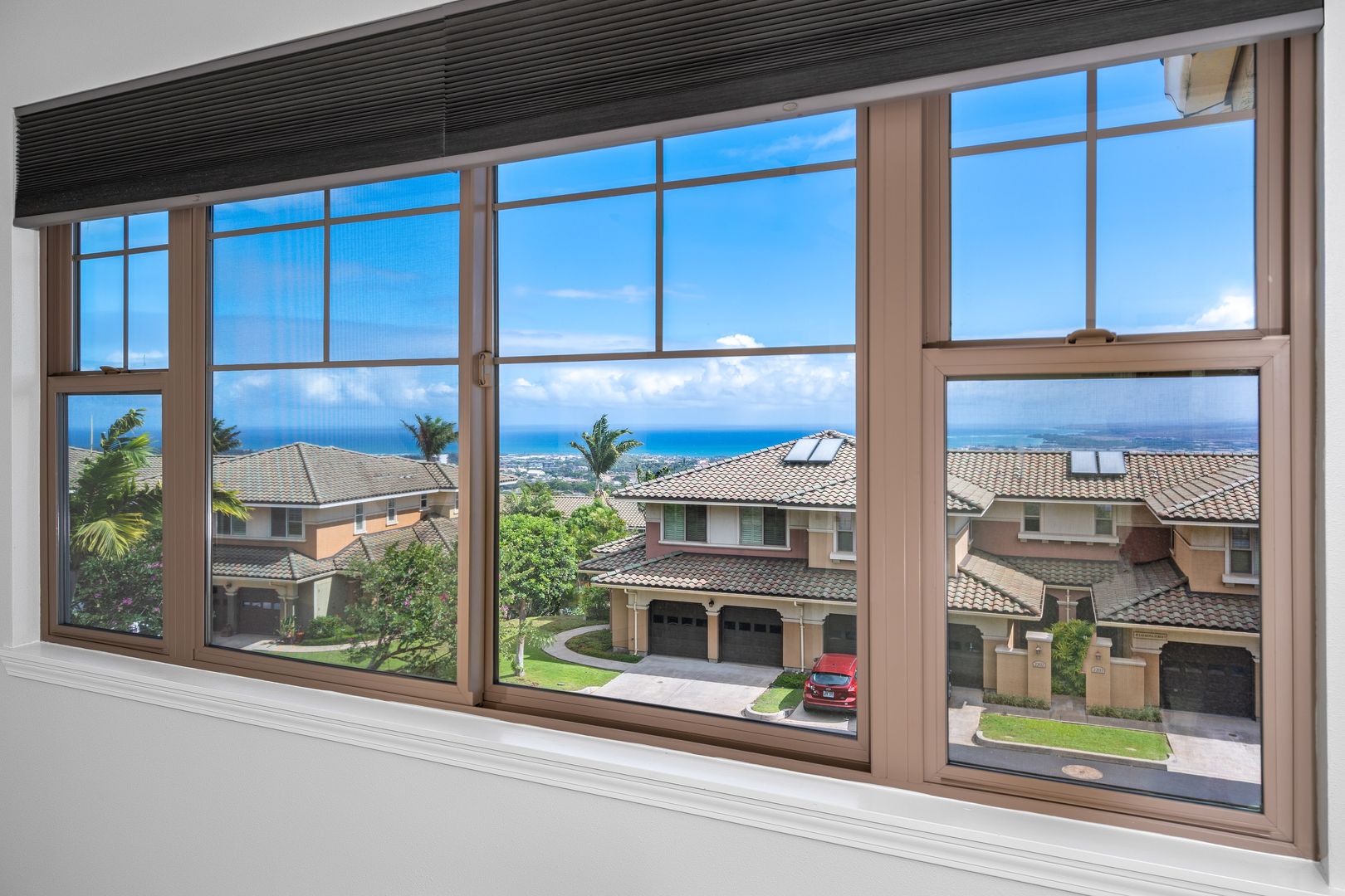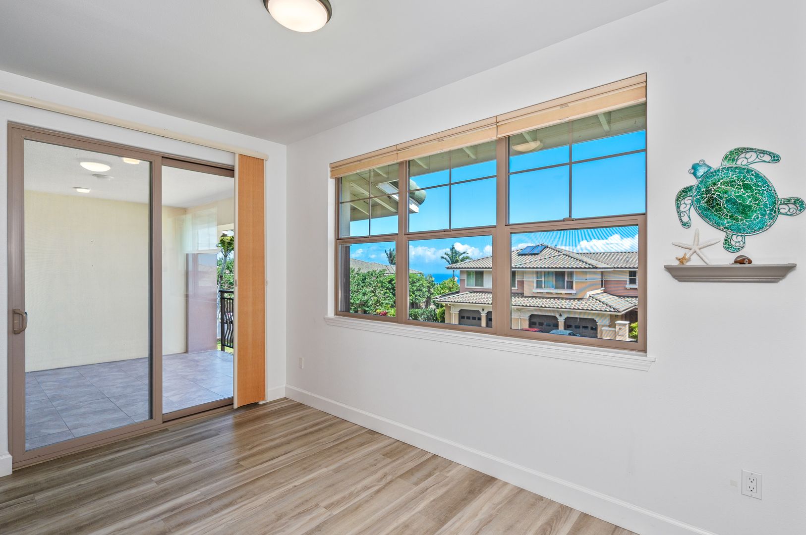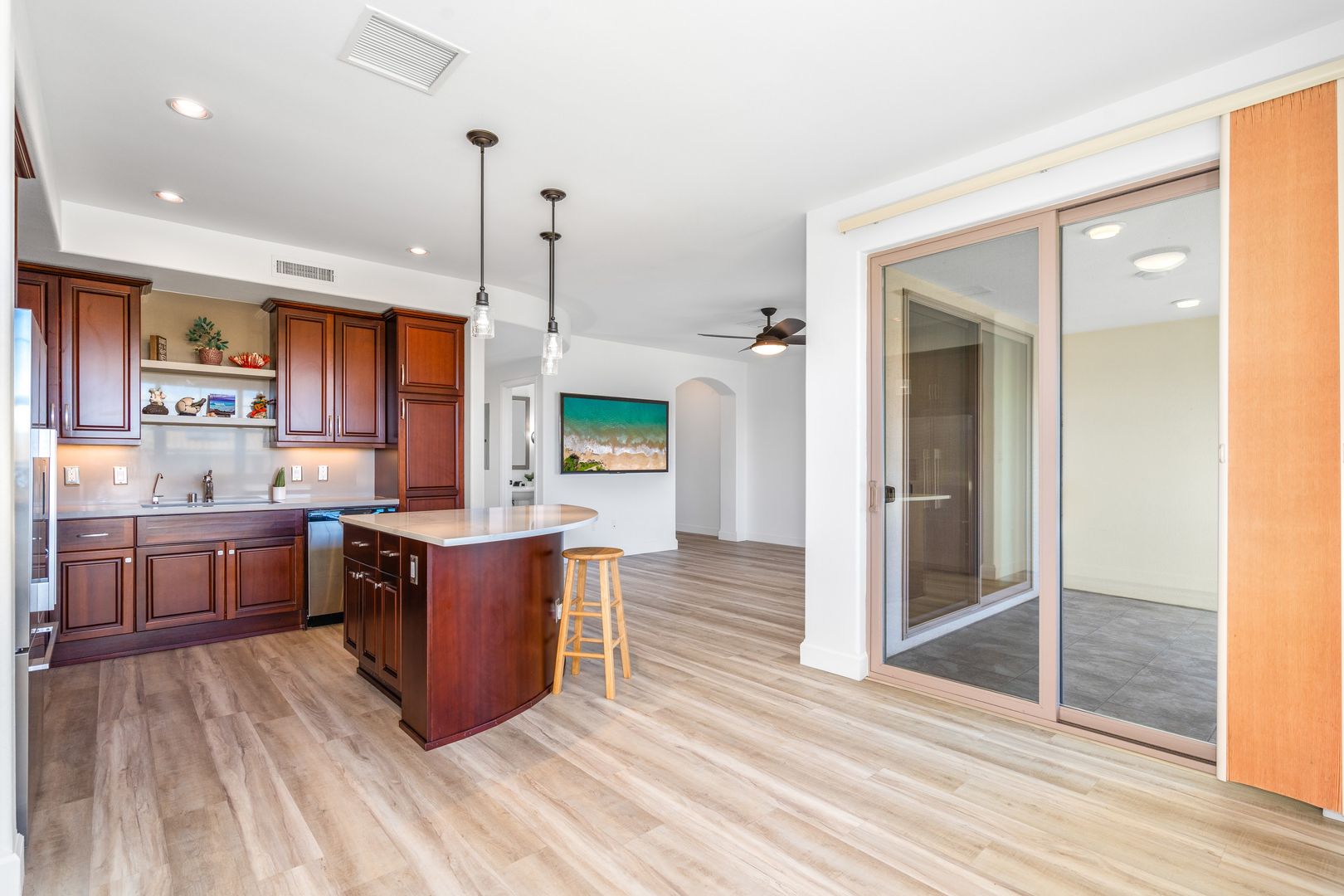 Beautifully appointed townhome with luxury laminate plank flooring throughout the spacious two-level floor plan with high ceilings, stylish ceiling fans, and custom window treatments. The living and dining area boasts an open floor plan to take in the ocean views with an indoor/outdoor area with the lanai sliding glass window to your private covered lanai! Relax in the living area and watch movies on the big-screen wall-mounted Smart T.V. The kitchen is equipped for the chef of the family and includes all the stainless steel appliances, including built in microwave and dishwasher, quartz countertops, with a Kitchen Island and plenty of cabinet space.