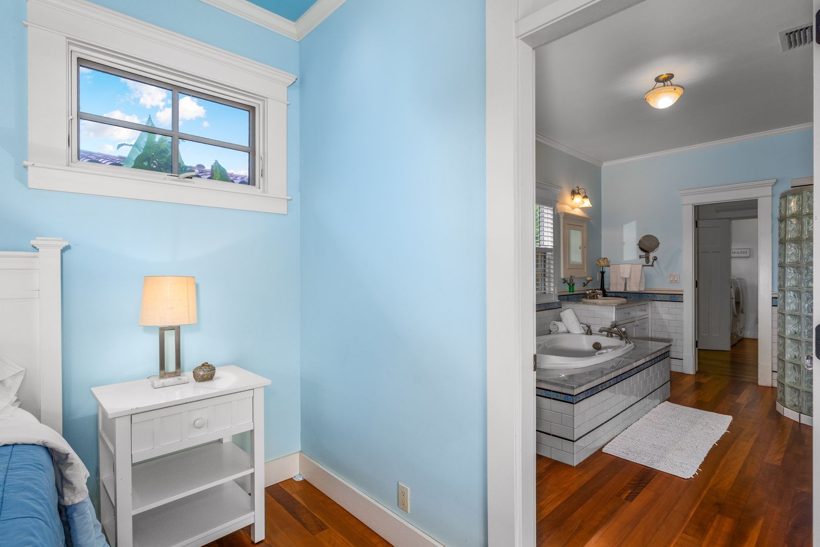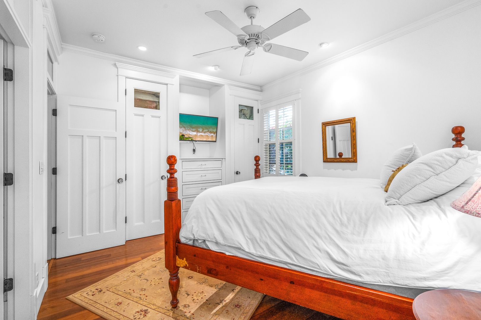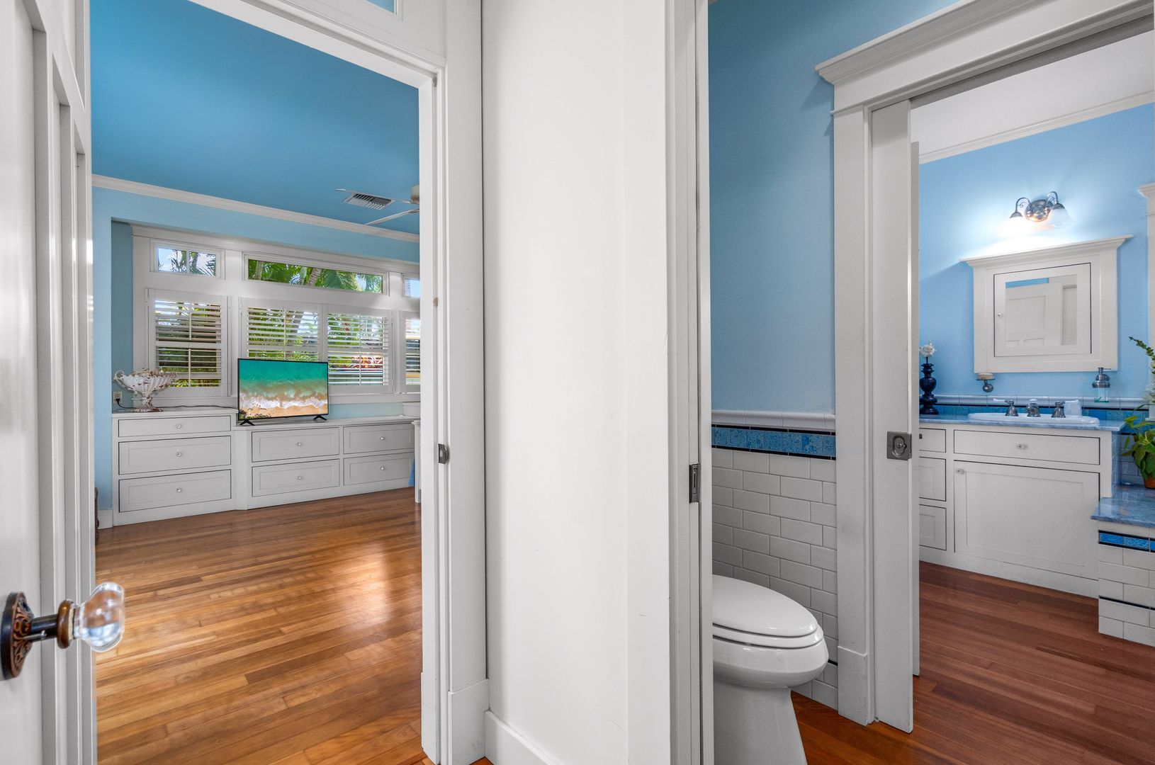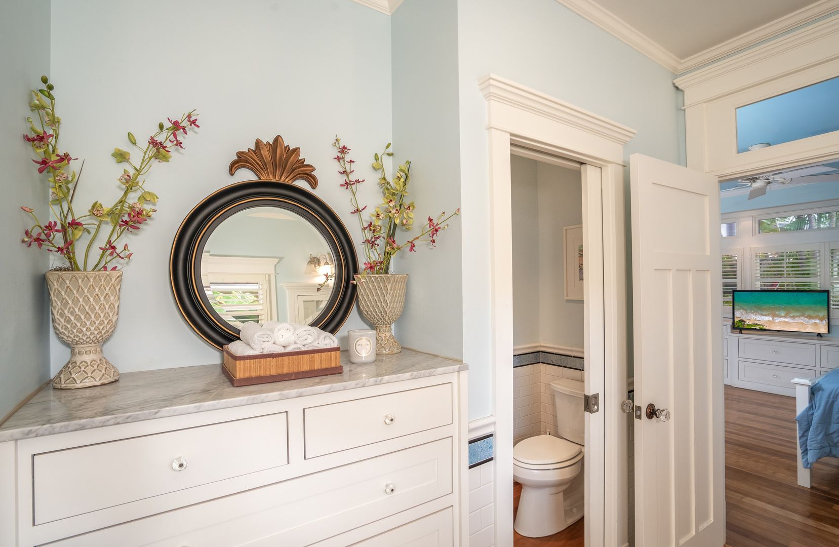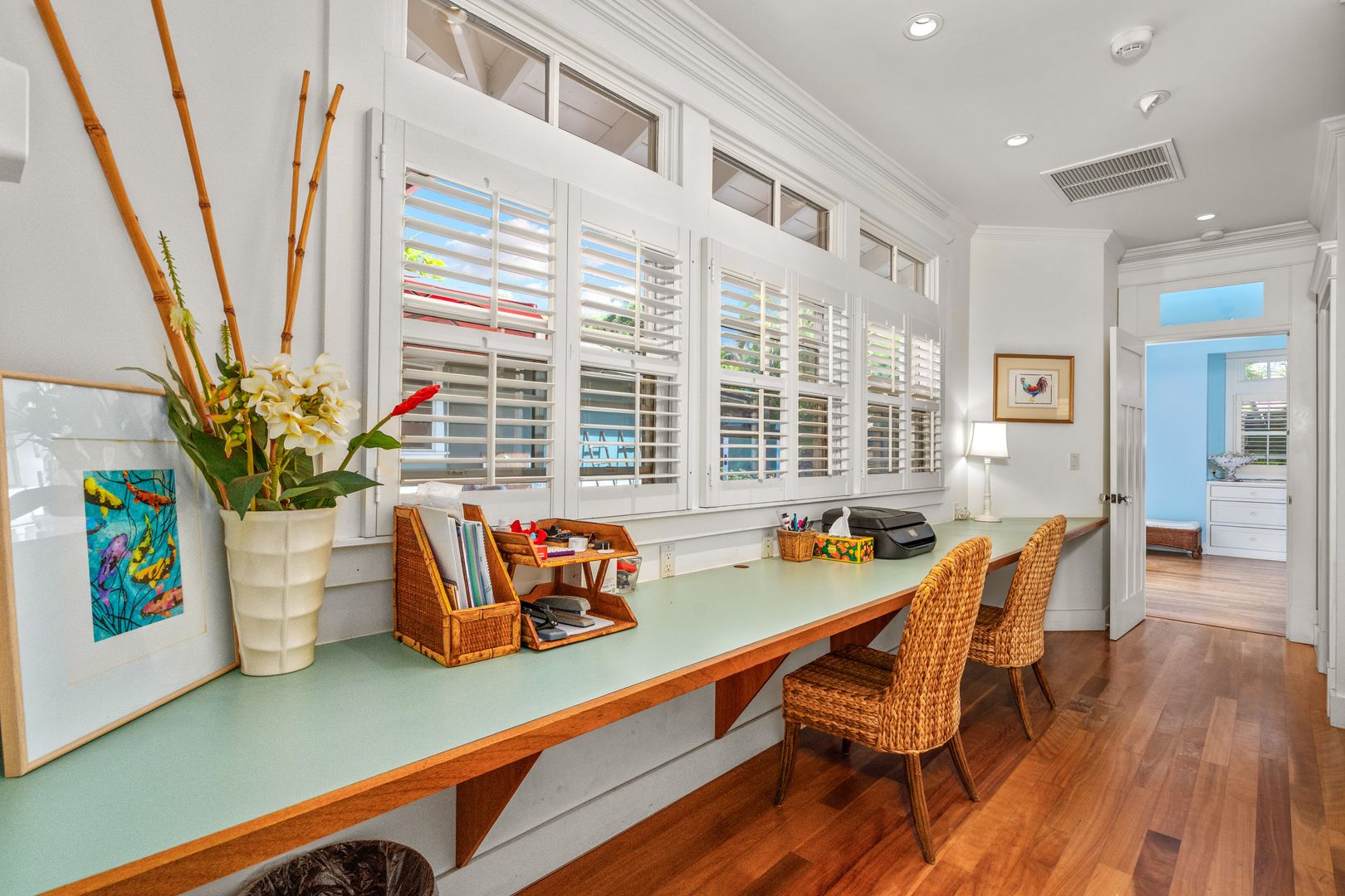 The elegant primary suite features many built-ins including 10 drawer dresser, furnished with a King Bed, office area, sliding glass door beckons opening to the courtyard pool area, offering a year-round invitation to enjoy Maui's perfect weather. Revel in the luxurious walk-in closet and the primary bathroom ensuite with soaking tub and shower.