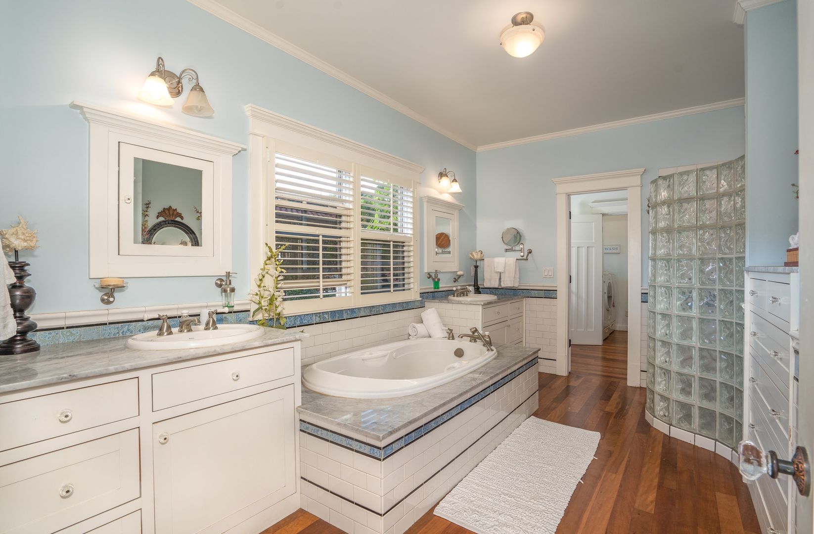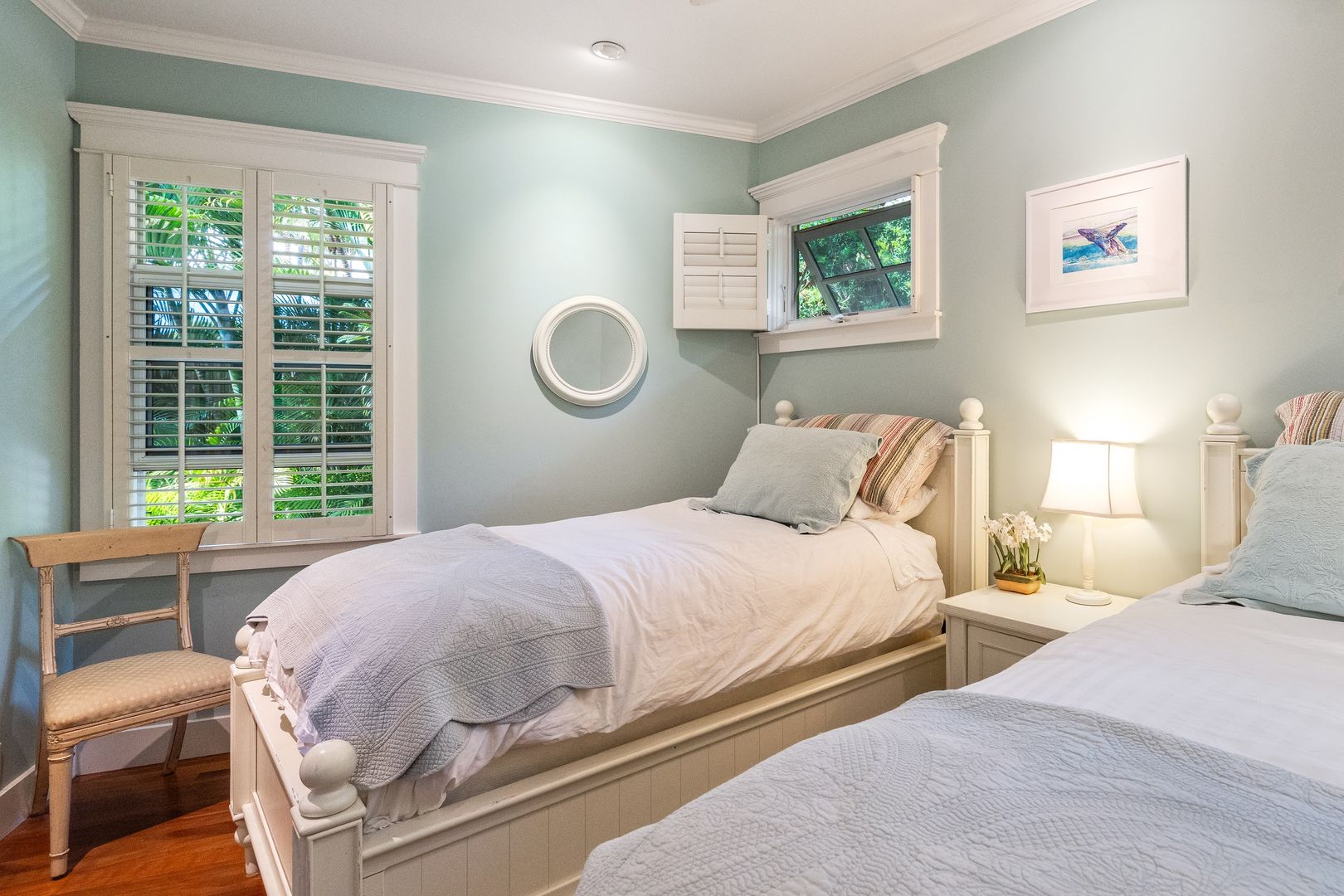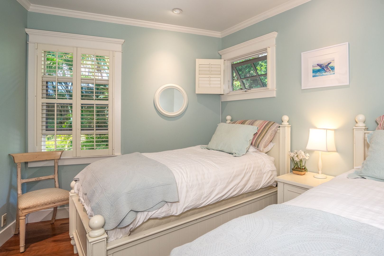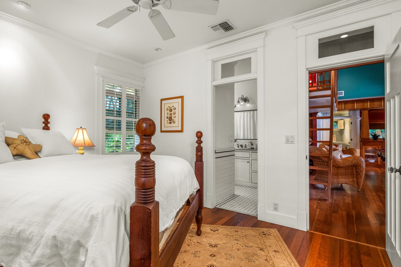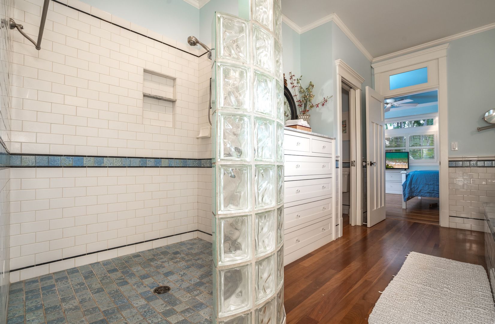 The elegant primary suite features many built-ins including 10 drawer dresser, furnished with a King Bed, office area, sliding glass door beckons opening to the courtyard pool area, offering a year-round invitation to enjoy Maui's perfect weather. Revel in the luxurious walk-in closet and the primary bathroom ensuite with soaking tub and shower.