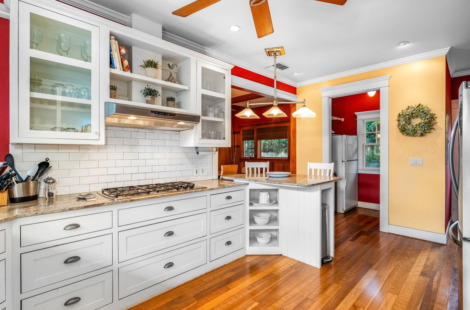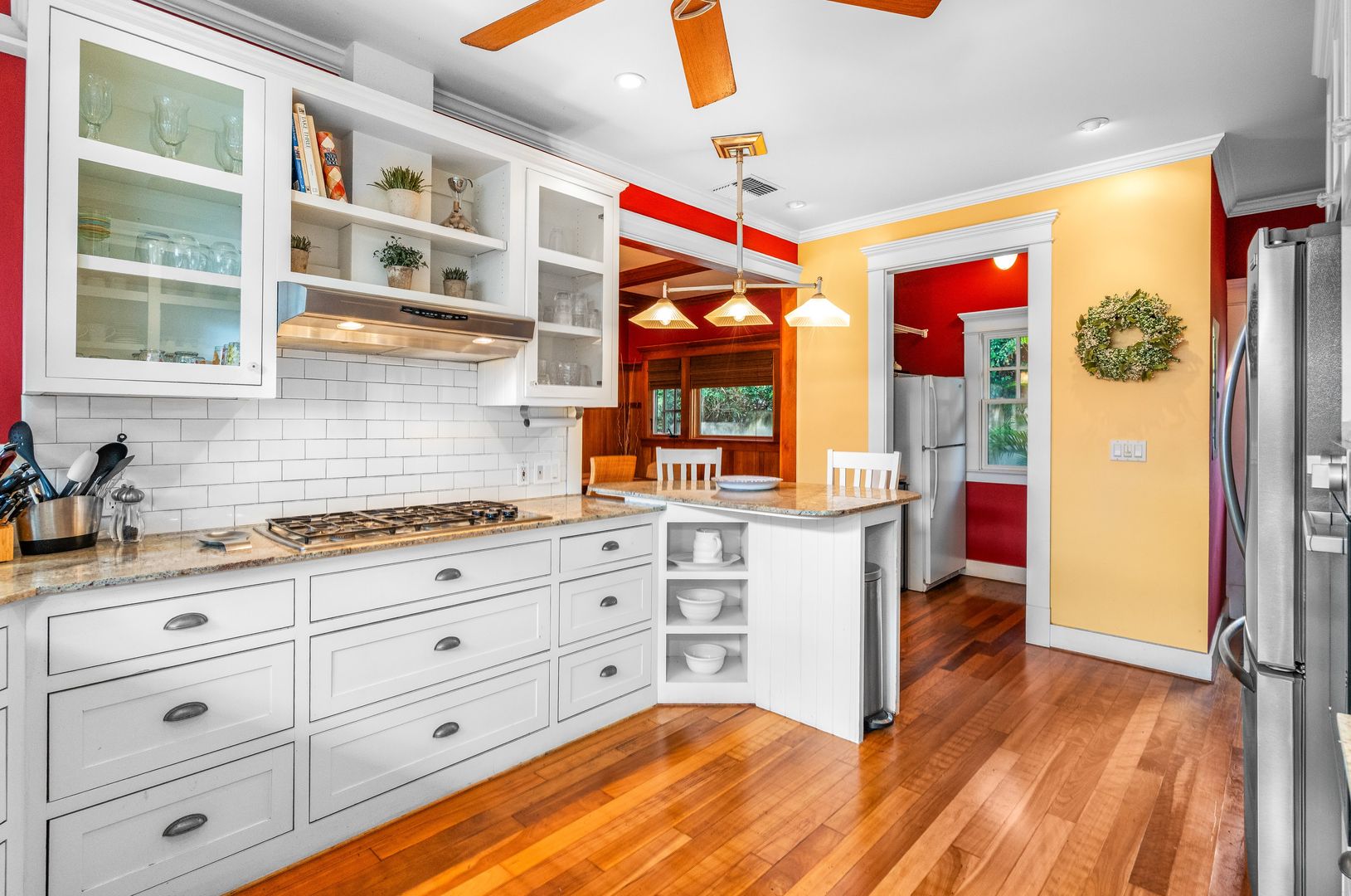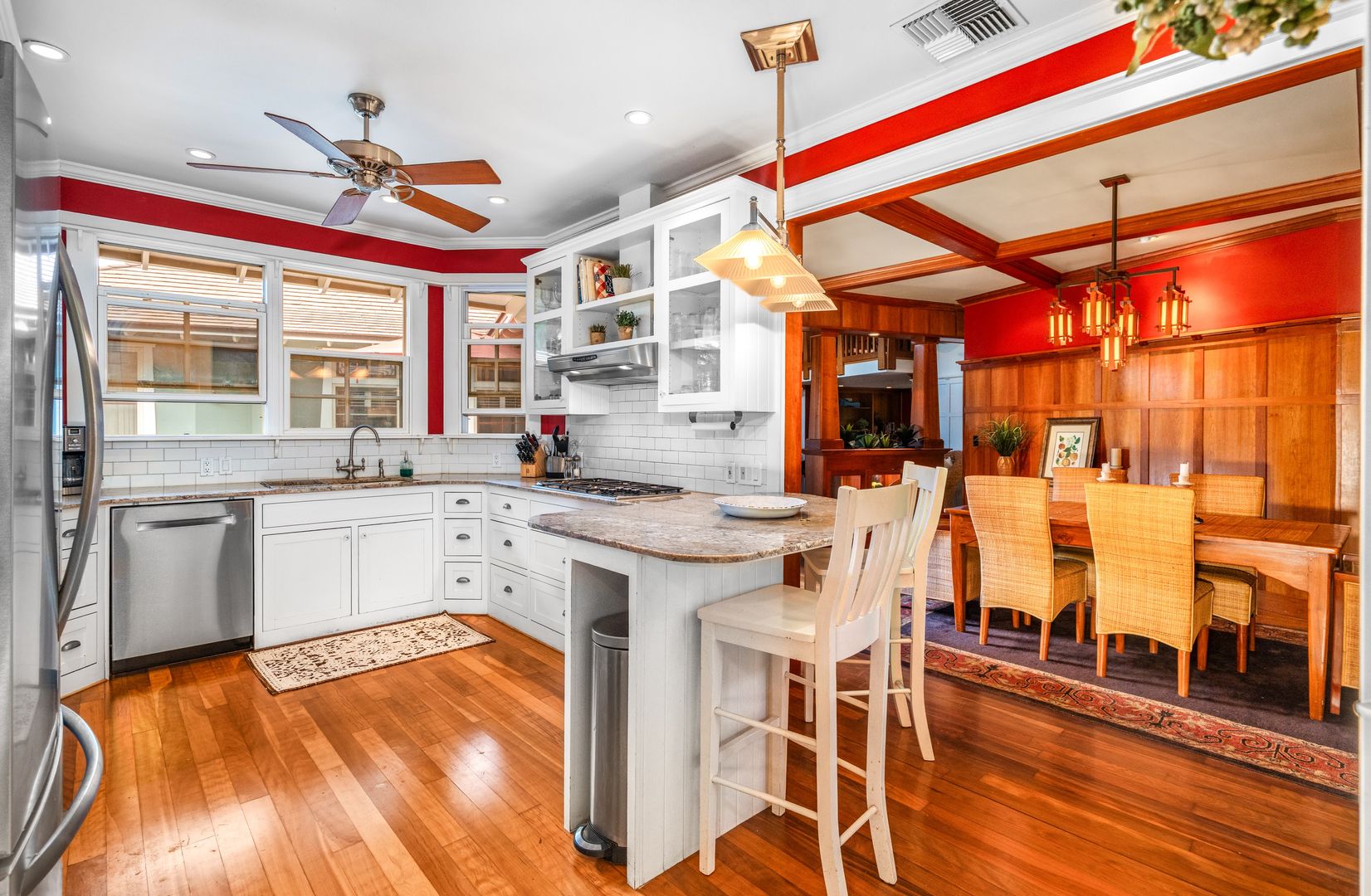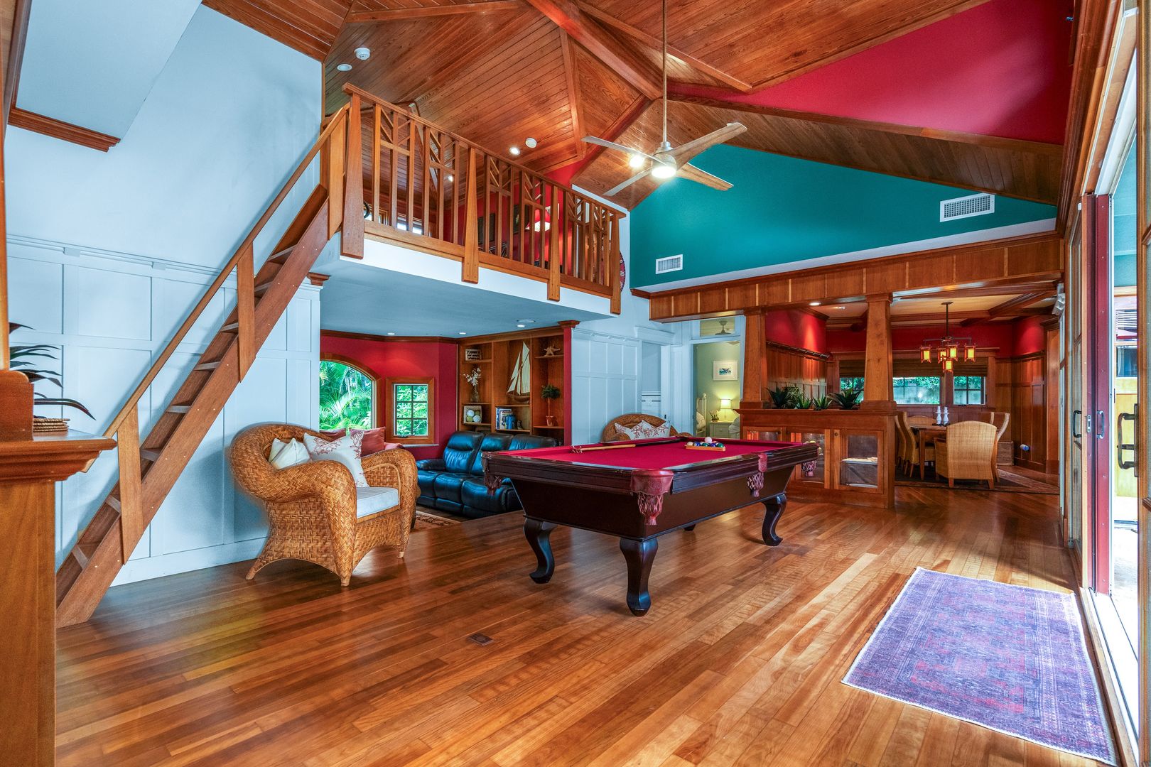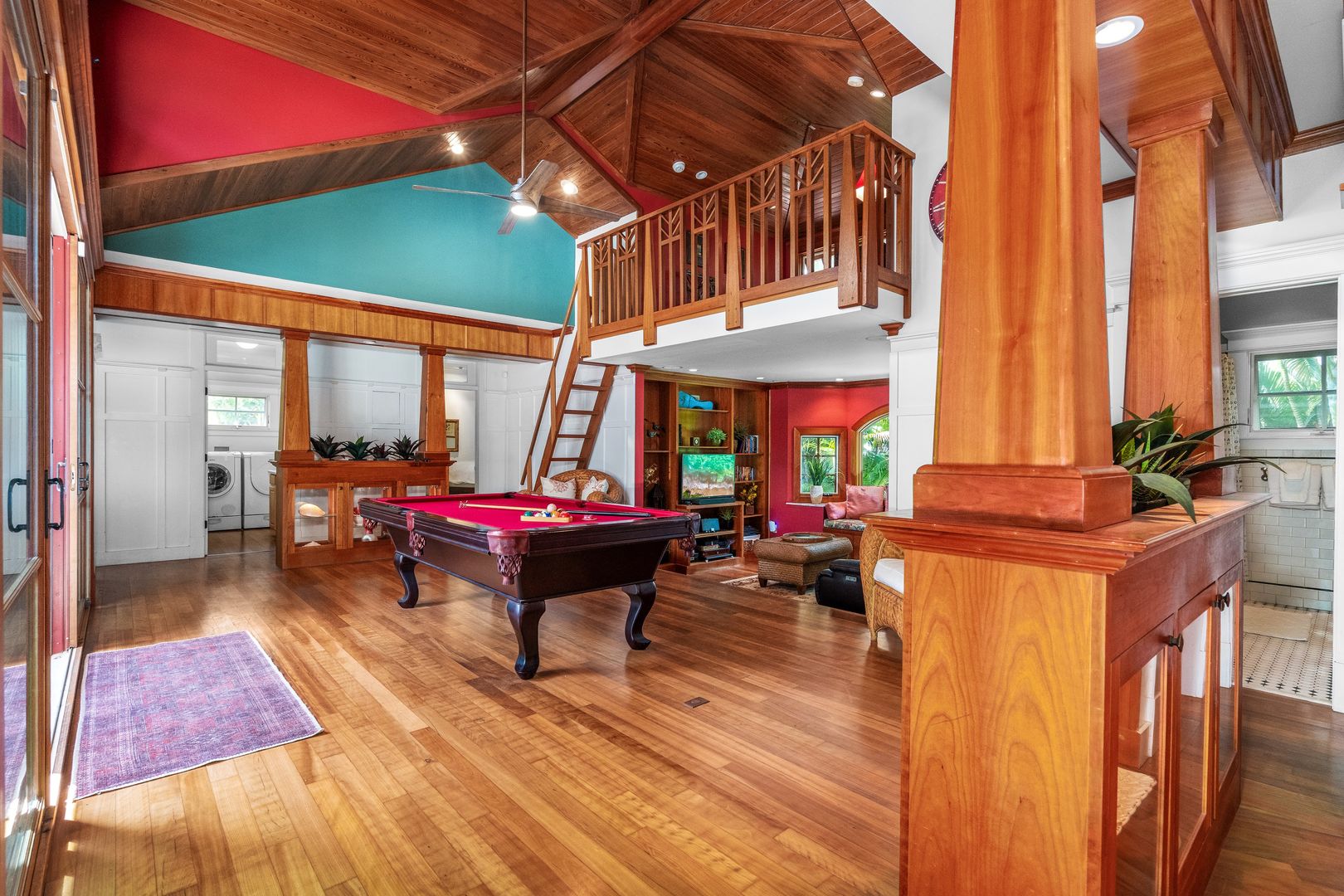 The chef's kitchen boasts granite countertops, white cabinets, stainless steel appliances, with a gas range, the hardwood flooring flows seamlessly into the dining and living areas. The floor plan includes a spacious living area with a pool table to enjoy that opens to a vaulted ceiling and a bonus comfortable furnished loft area.