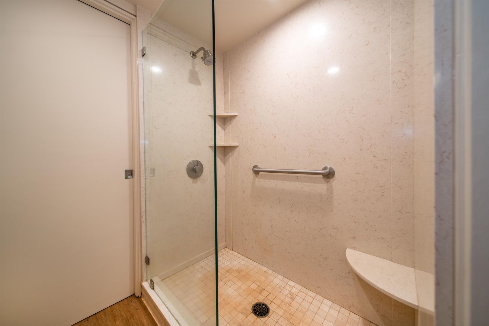 The modern ensuite primary bath has a space saving pocket door, hard surface countertop with a glass bowl sink, tall flowing faucet and beautiful vinyl flooring. The walk-in shower has glass doors, a bench, two shelves and a safety bar.