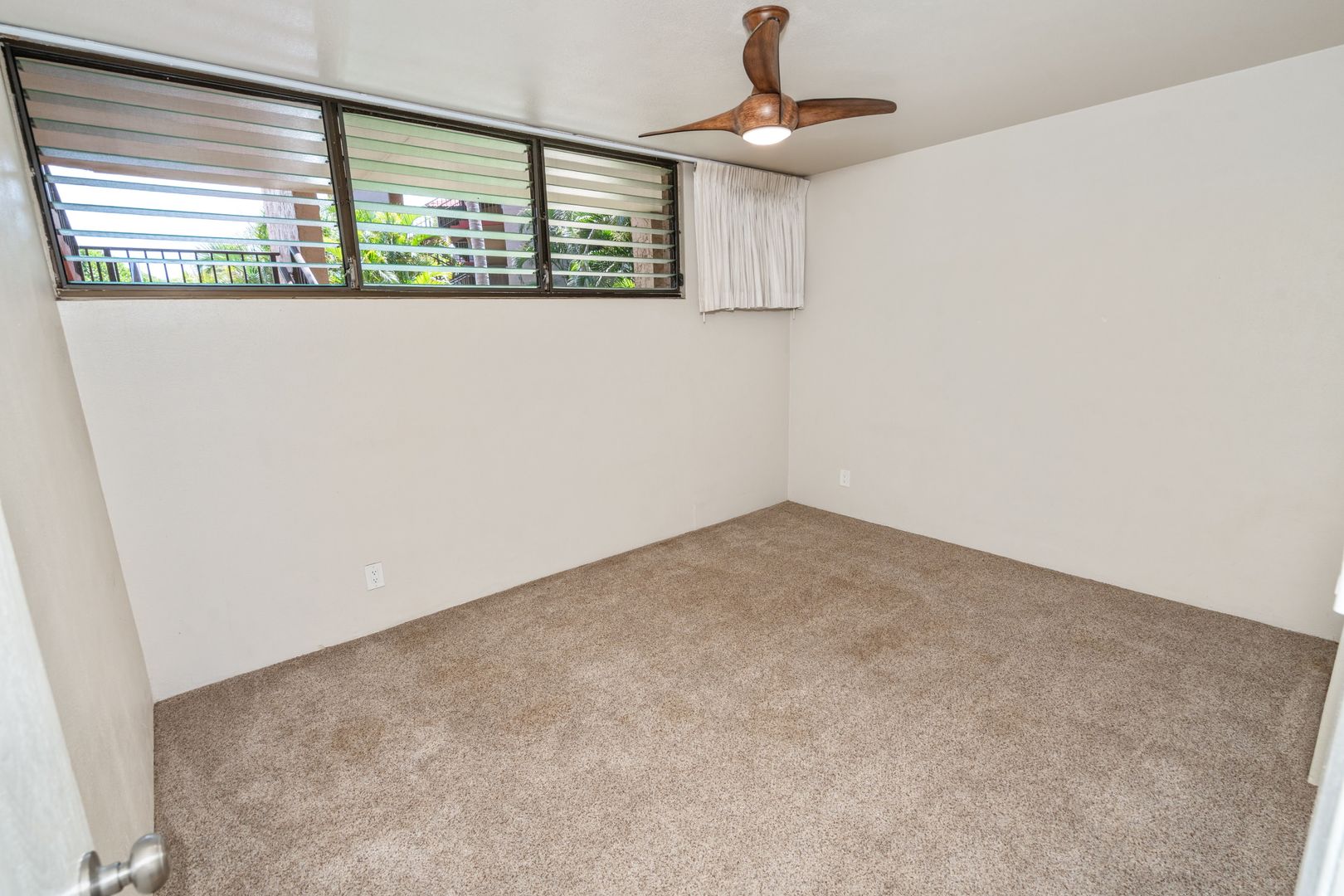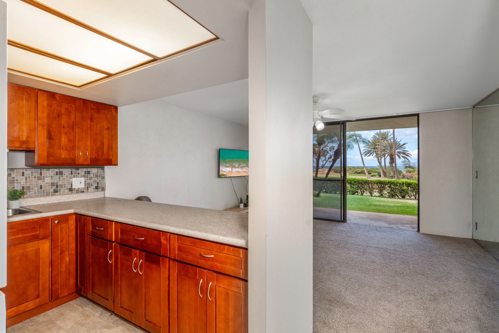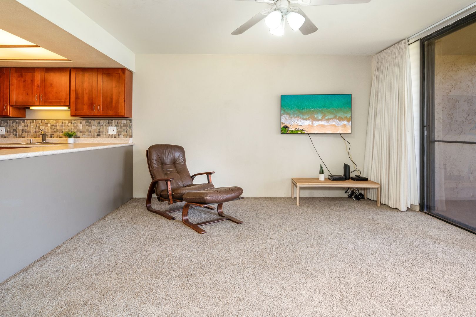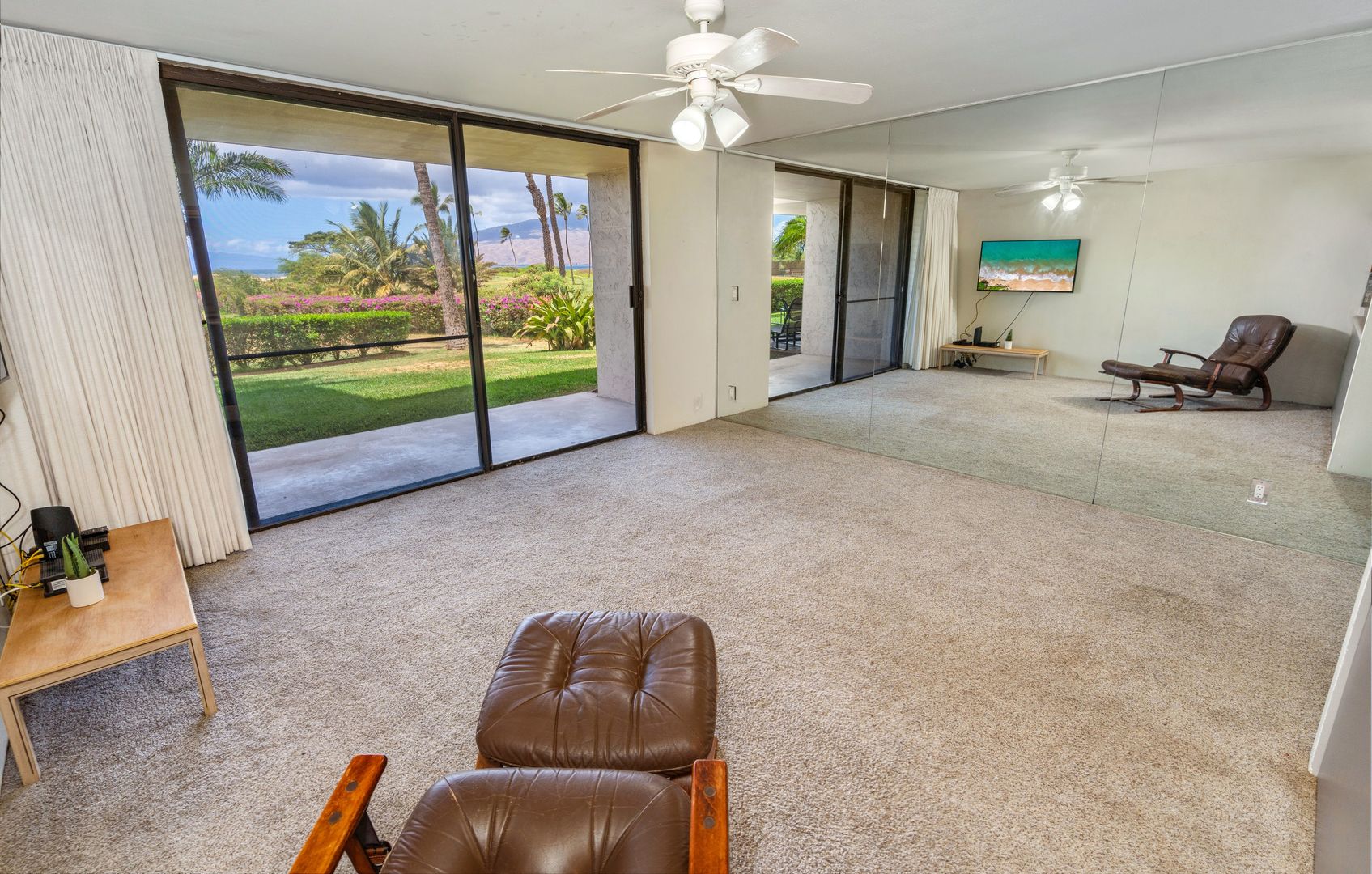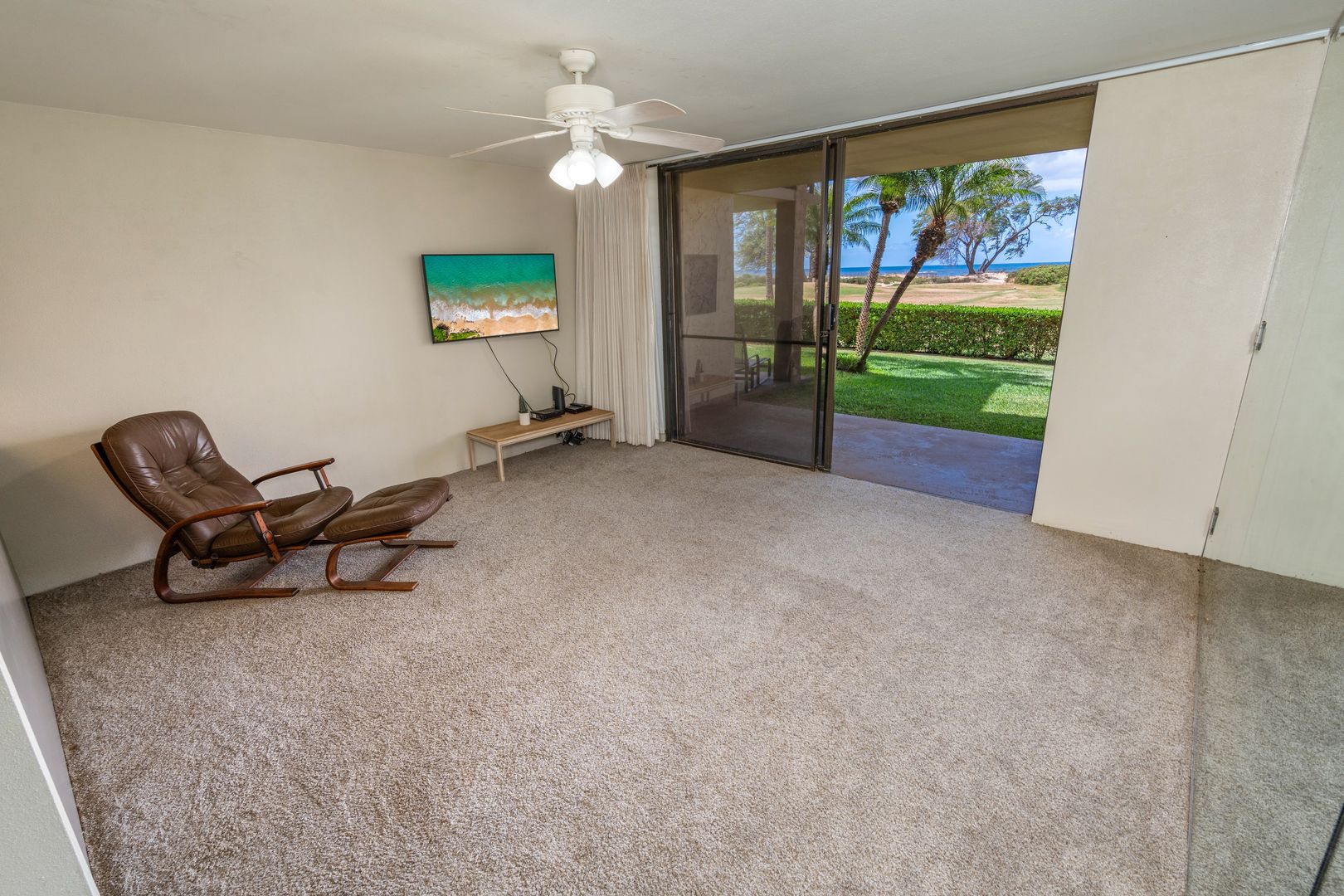 Unfurnished with tile and carpet floors that flow throughout the spacious floor plan with ceiling fans, and window treatments. The living area has carpet though out with a wall mounted Smart TV, sliding glass door to take in the indoor/outdoor area with the lanai sliding glass window to your covered lanai and steps to the oceanfront.