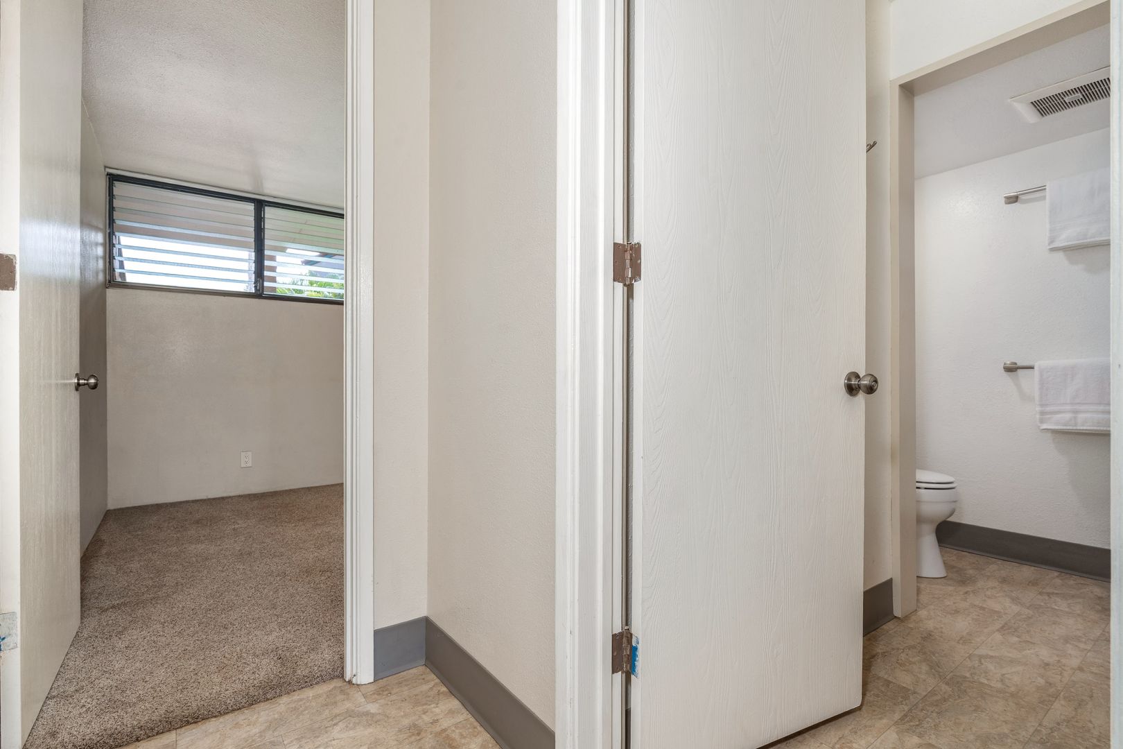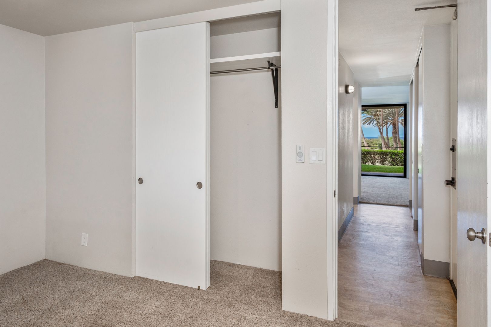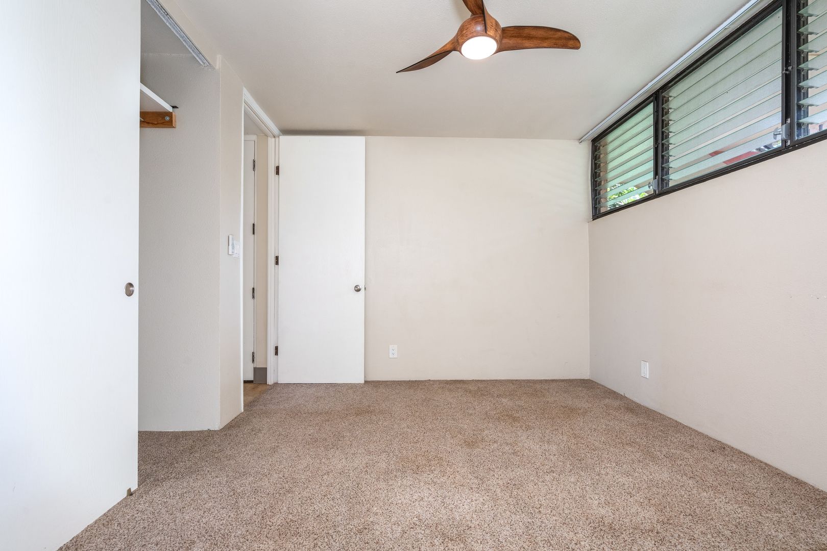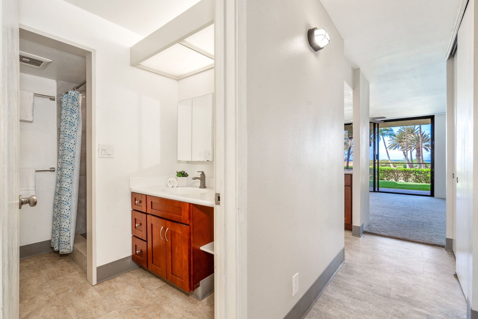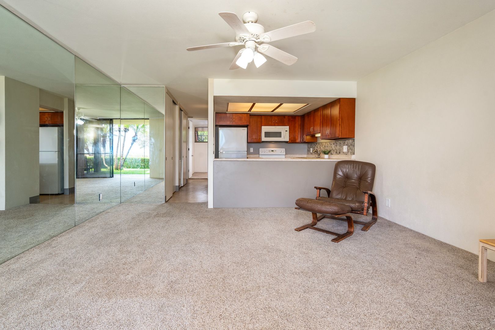 Unfurnished with tile and carpet floors that flow throughout the spacious floor plan with ceiling fans, and window treatments. The living area has carpet though out with a wall mounted Smart TV, sliding glass door to take in the indoor/outdoor area with the lanai sliding glass window to your covered lanai and steps to the oceanfront.