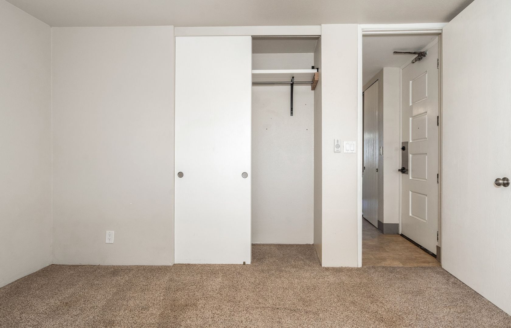 The bedroom has carpet throughout with a closet. The bathroom is spacious with a vanity sink and walk-in shower.
