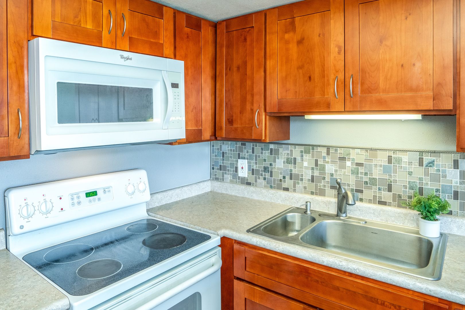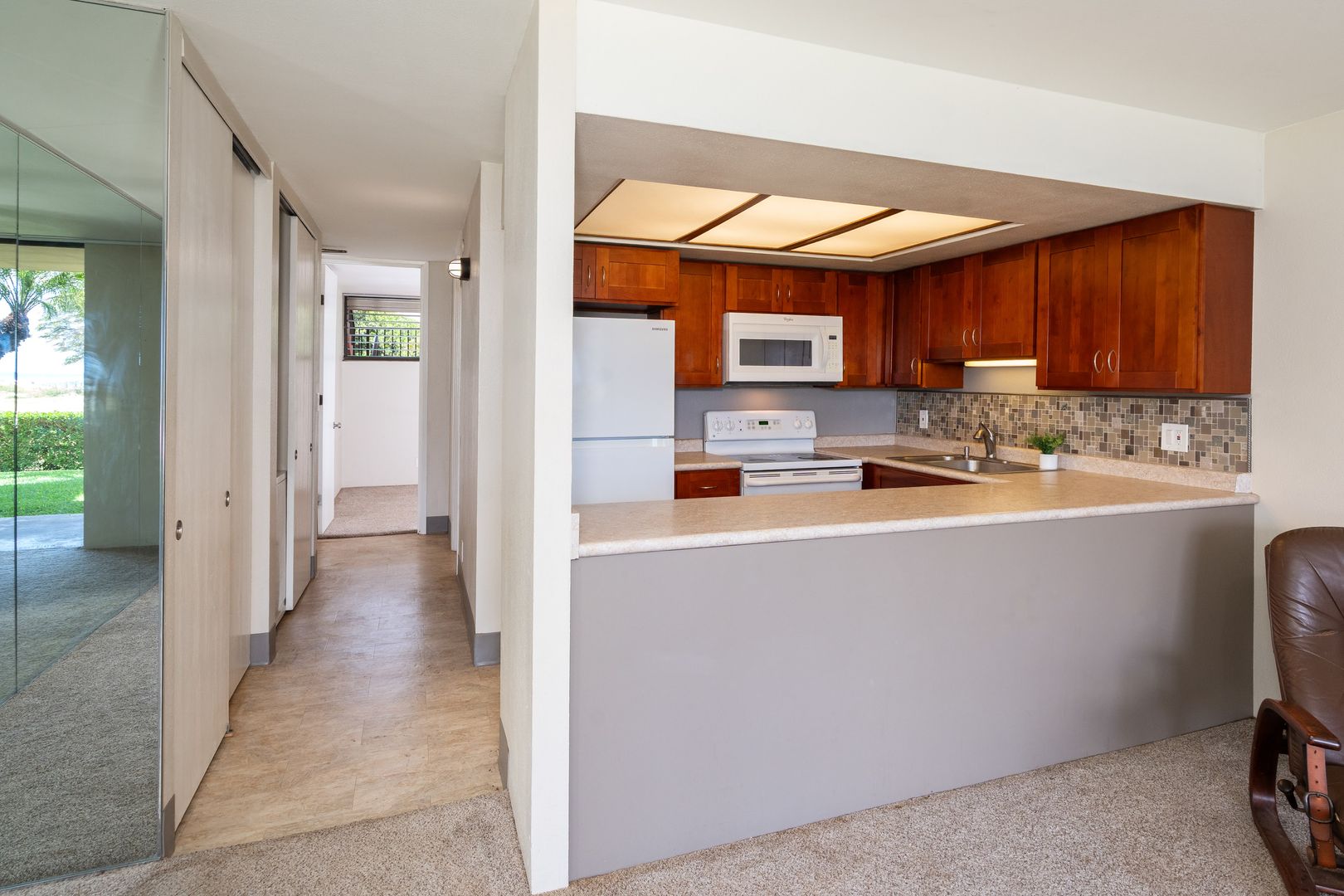 The kitchen is equipped with all the appliances, and plenty of cabinet space.