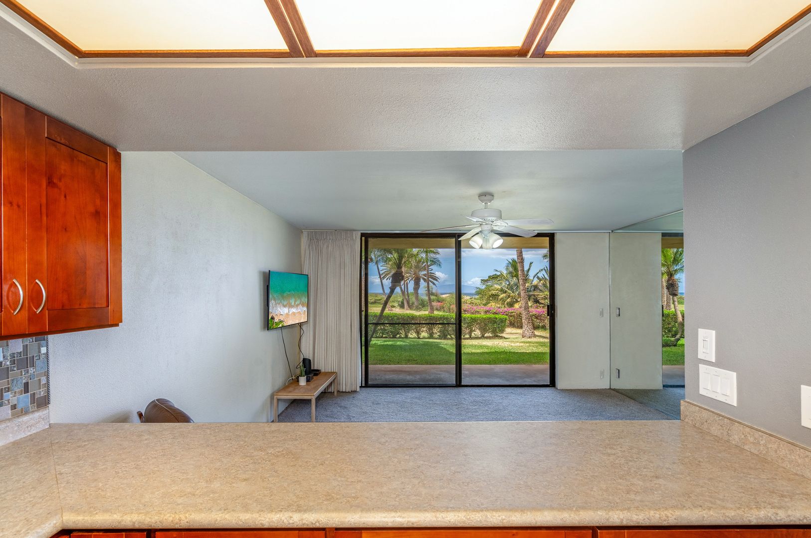 Enjoy Maui’s spectacular sunsets from the kitchen, living room and lanai, with views of the Pacific Ocean and West Maui Mountains, with Molokai in the distance.