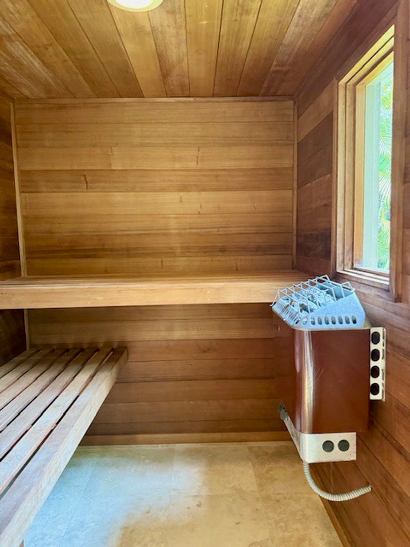 Wake up to ocean vistas in the main floor primary suite, featuring Acacia floors, a luxurious ensuite bath includes a soaking tub with a separate shower, and double vanity sinks. Enjoy the sauna and an outdoor garden shower.