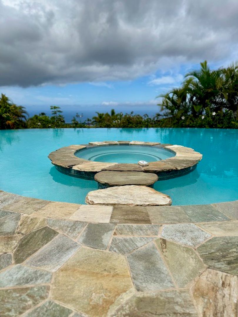 Lounge on the fully furnished slate patio around the fire-pit for a beautiful sunset dinner surrounded by gas tiki torches, or unwind in the heated infinity edge saltwater pool with a floating "island" spa.