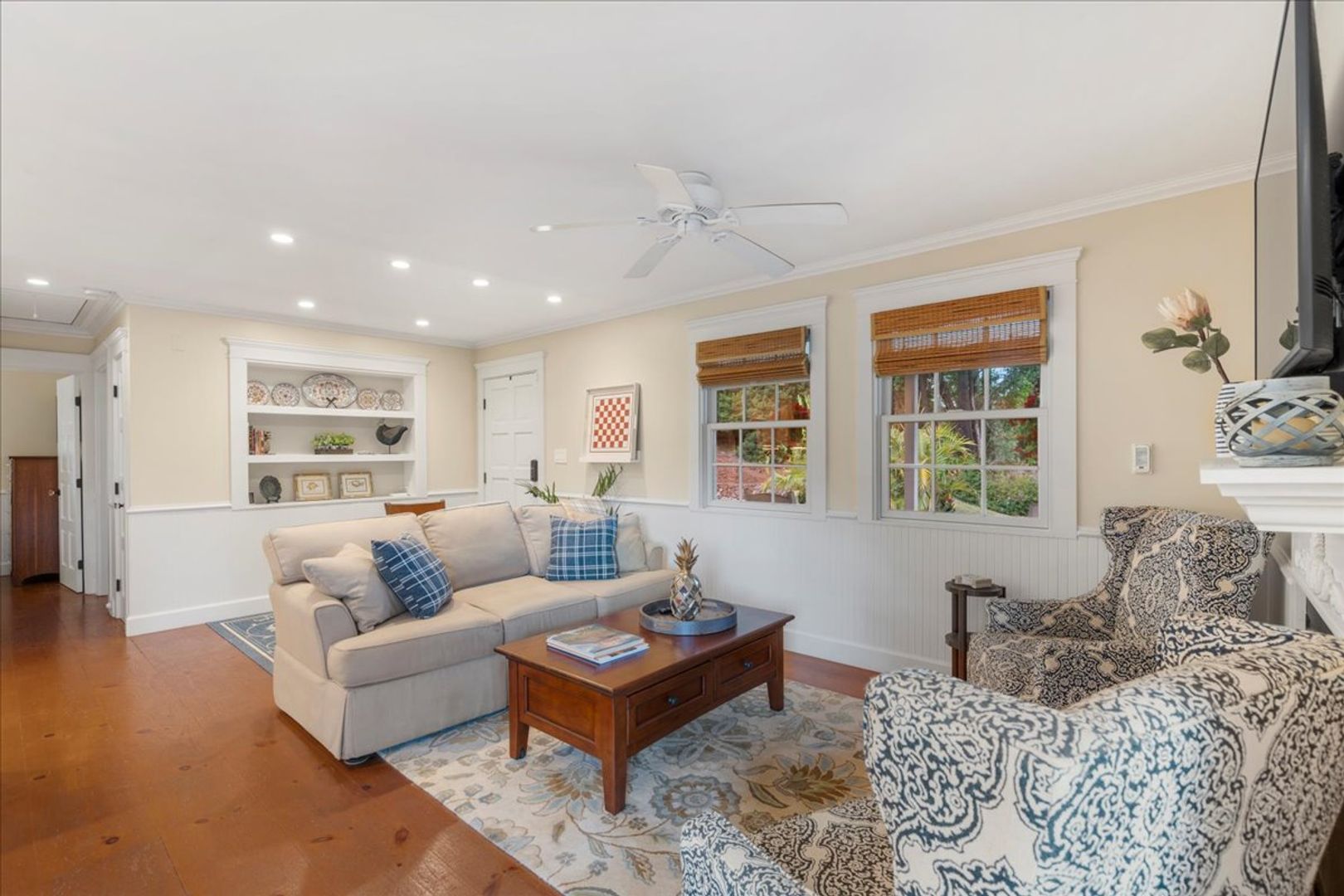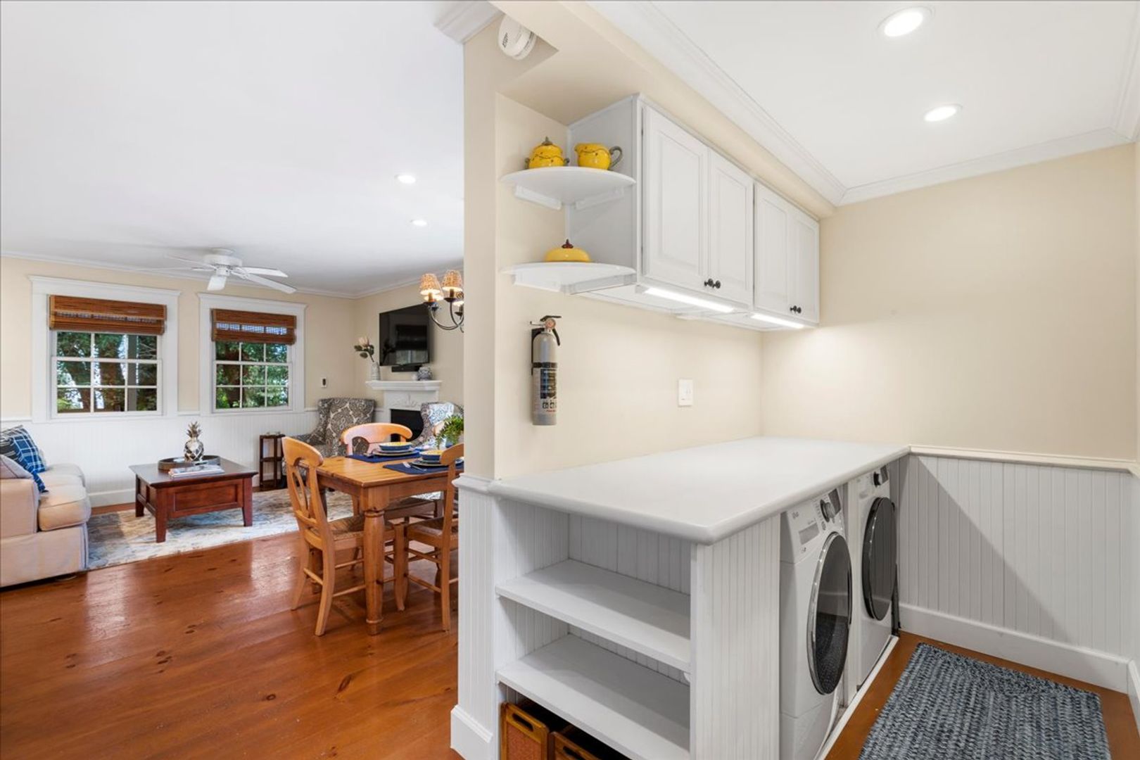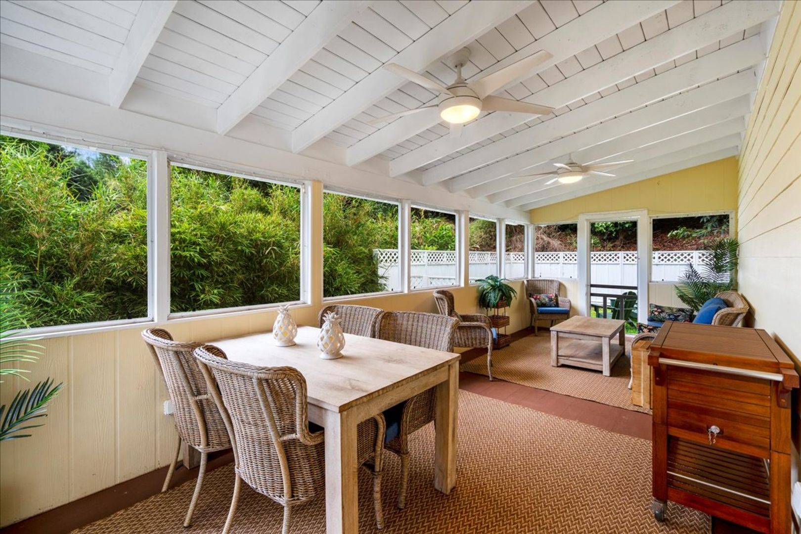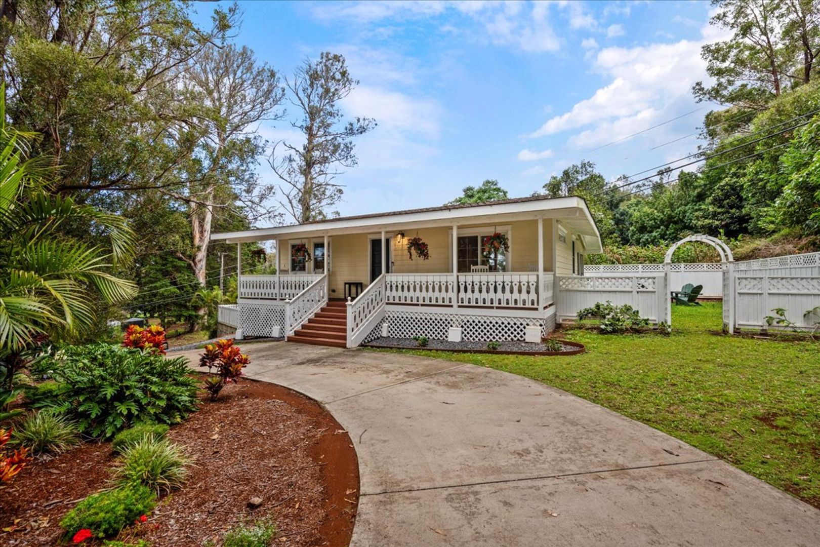 Enjoy the peaceful surroundings and manicured yard, this tastefully designed & furnished home features a roundabout driveway, rocking chairs on the front porch, a large screened in area, full kitchen with gas range and fireplace for the cool upcountry nights.