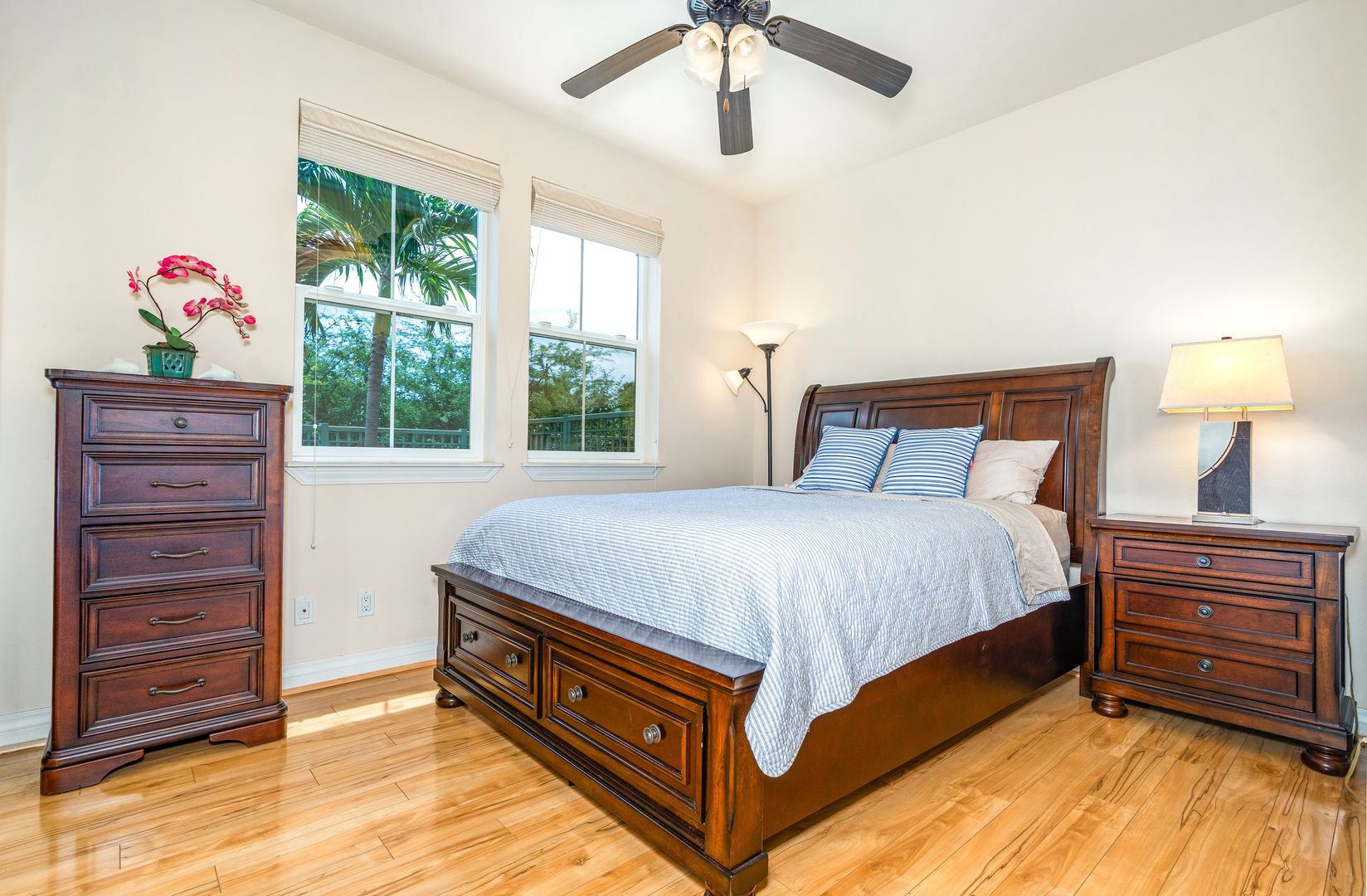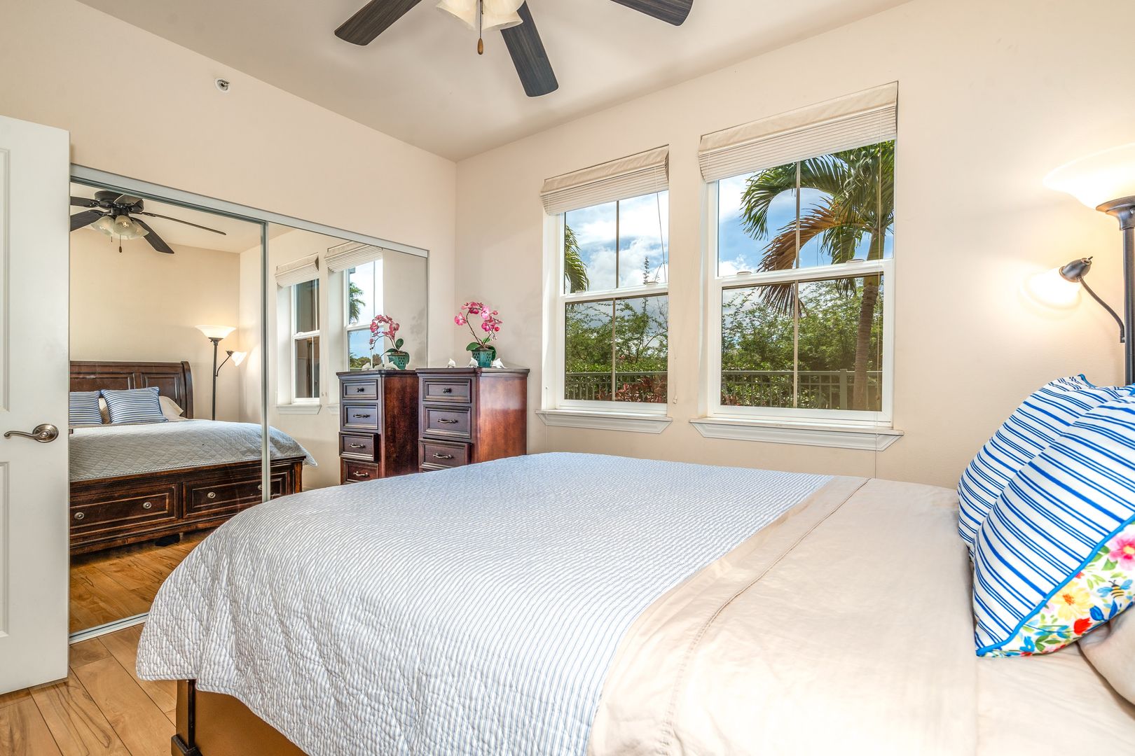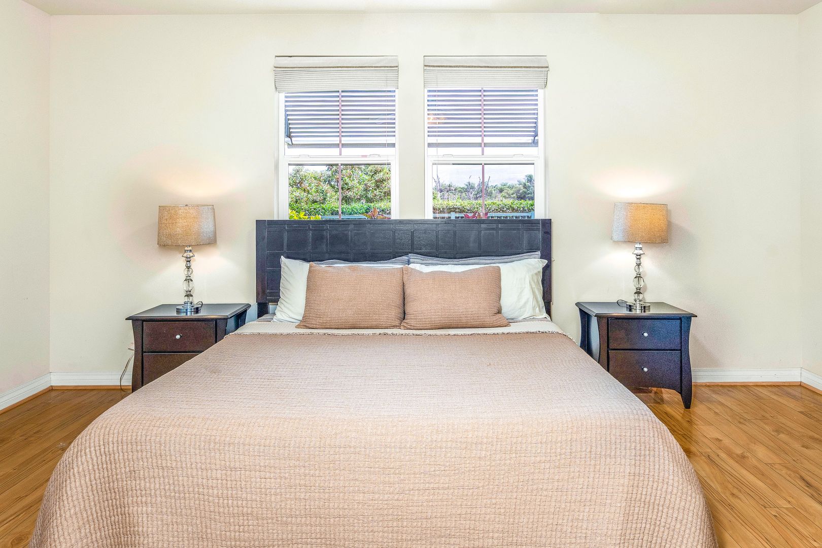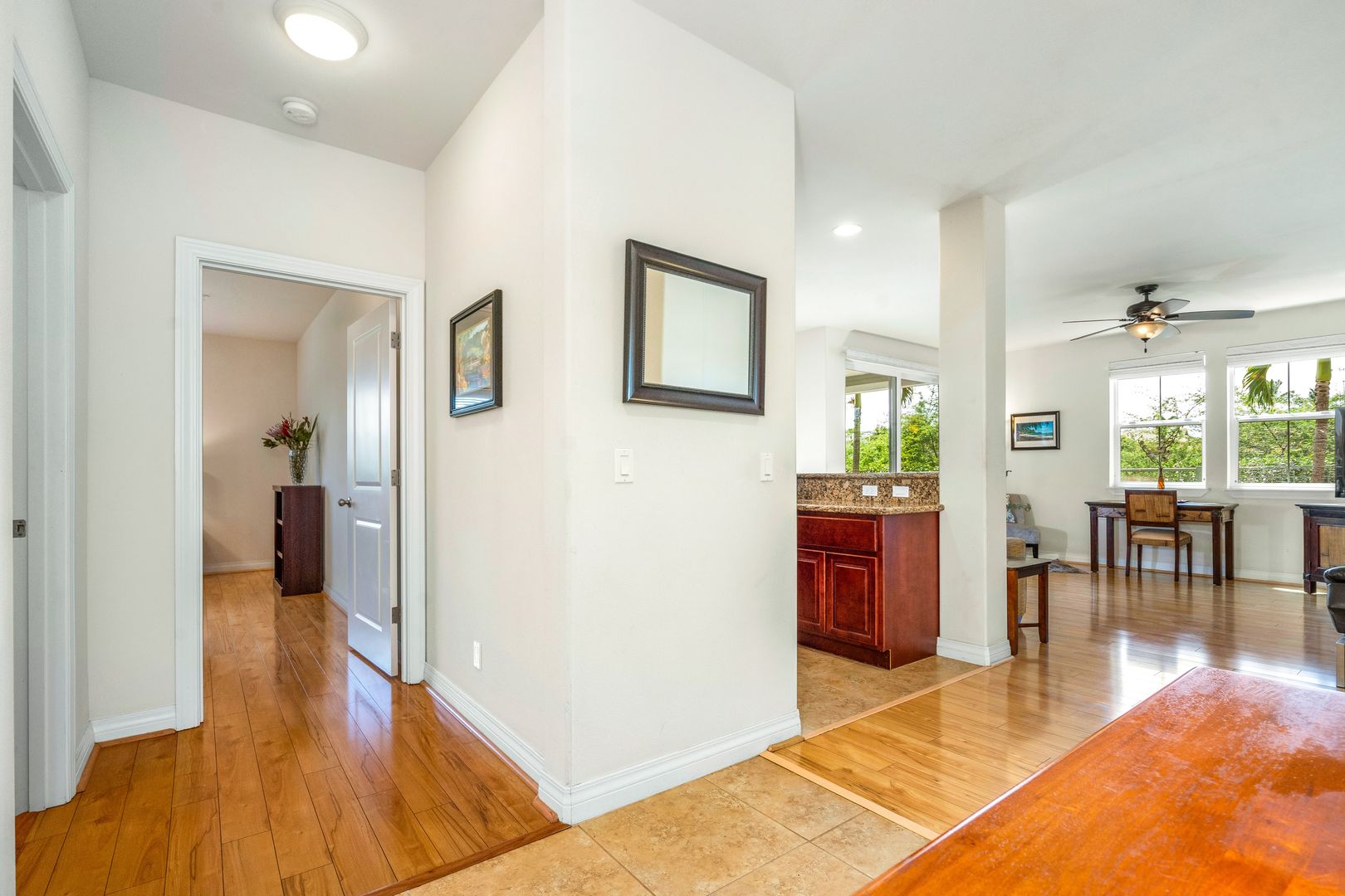 This beautiful fully furnished home is available now, approximately 1,300 sq. ft., 2 bedroom, 2.5 bath home is located in a highly sought after condo complex in central Kihei. Tasteful island style furnishings decorate the home and you'll also enjoy modern upgrades including Luxury Vinyl plank flooring, 4 split AC units, and privacy light blocking blinds. A guest half bathroom in the hallway.