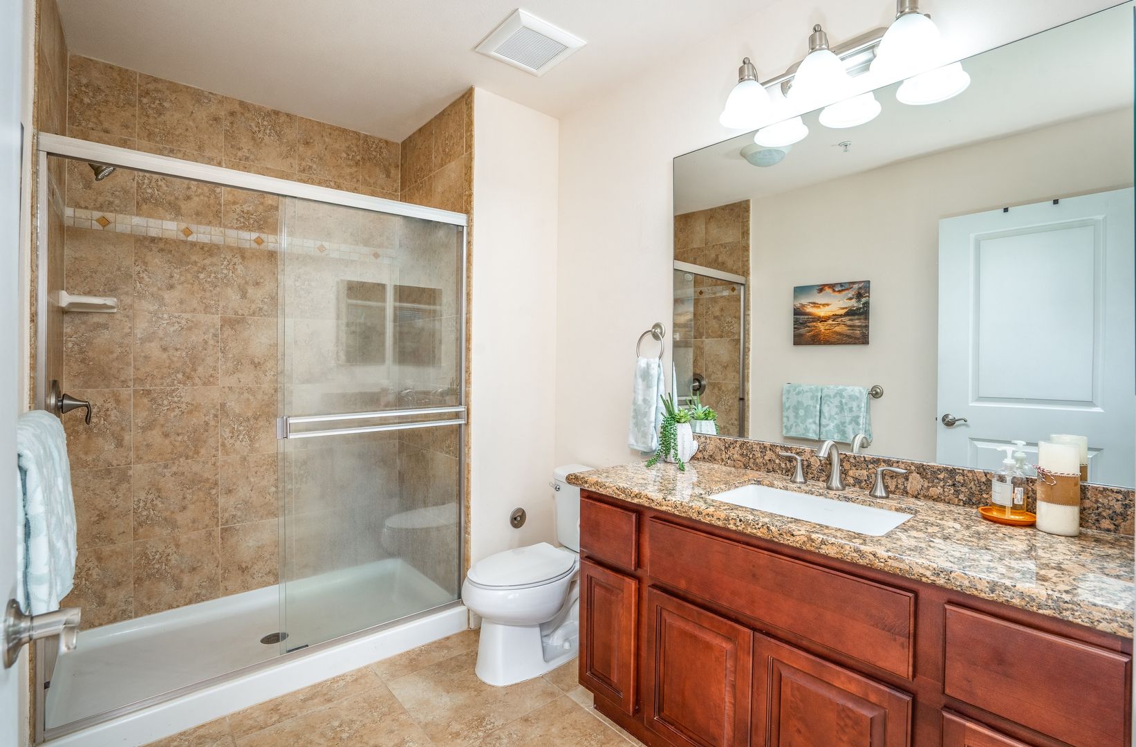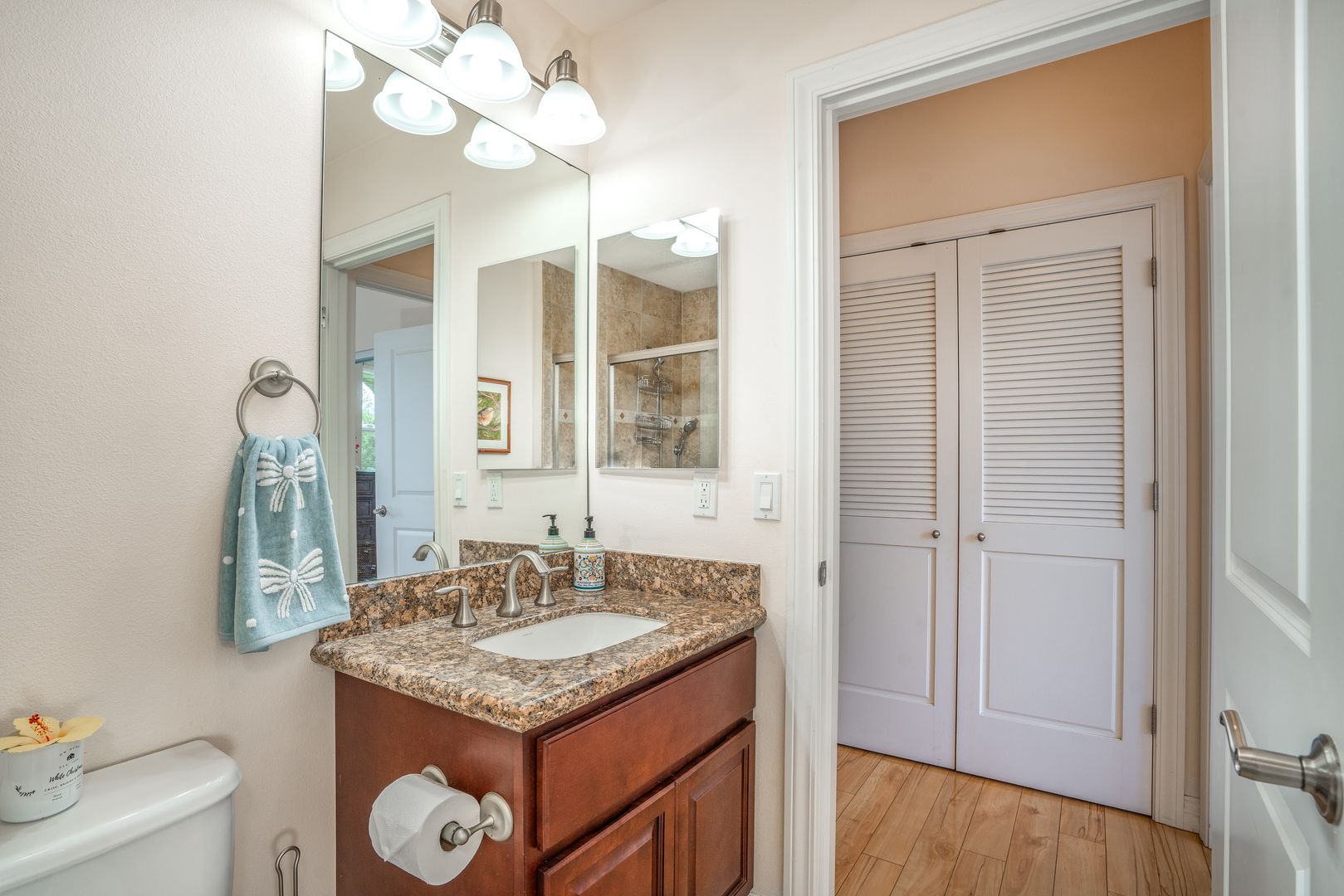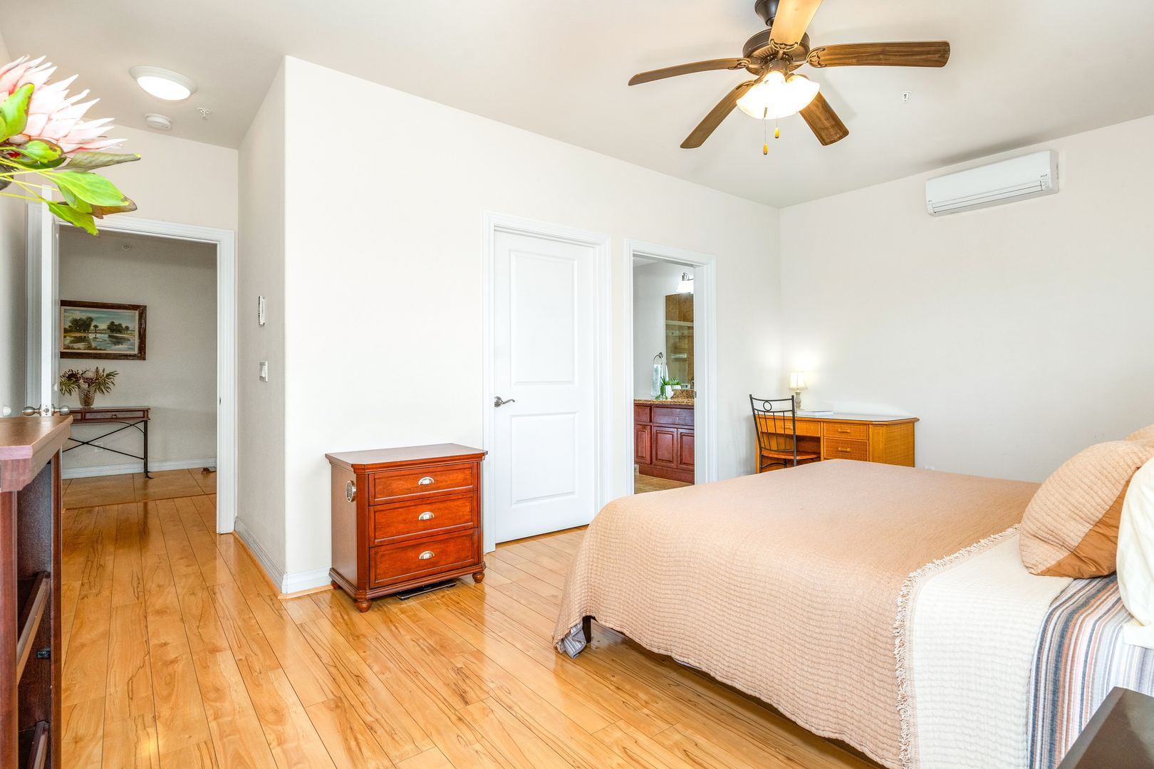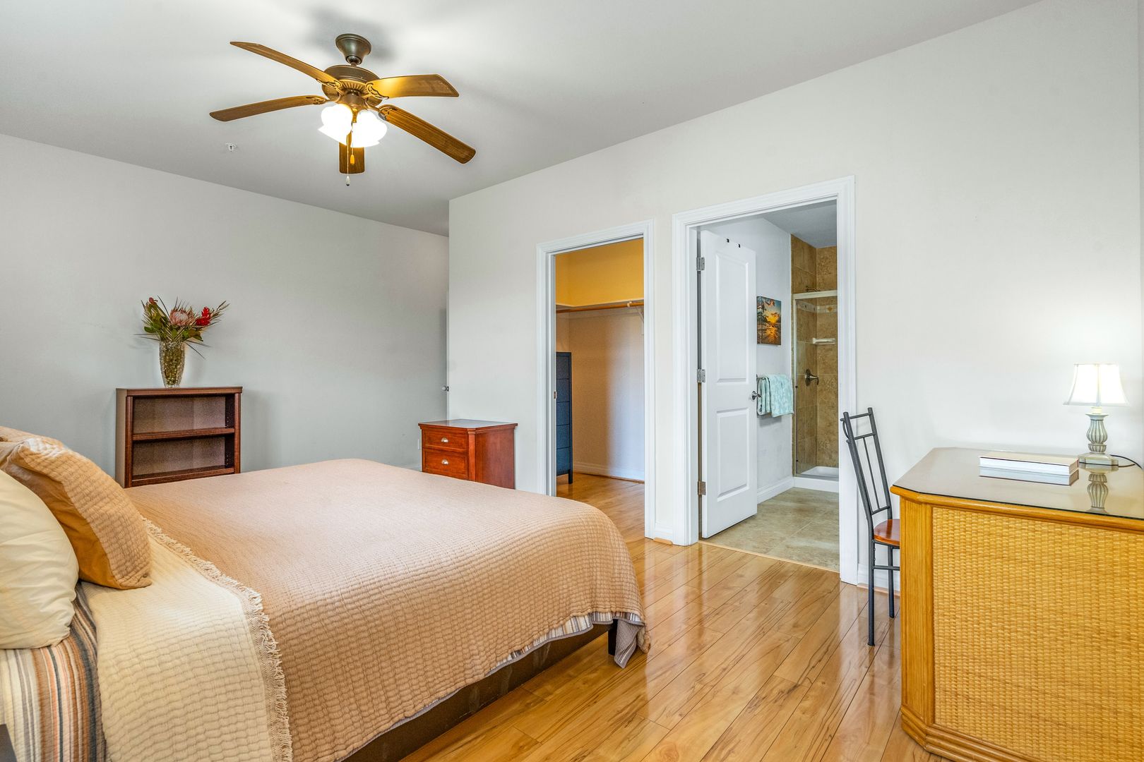 The spacious primary bedroom with a CalKing size bed and a walk in closet, an ensuite bathroom has granite countertops and a walk in shower. The second bedroom has a luxurious Queen size bed. The second bathroom off the bedroom hallway offers granite countertops and bathtub/shower combo.