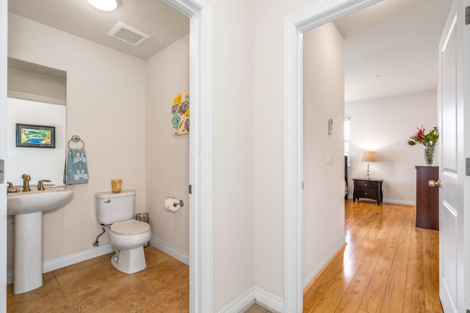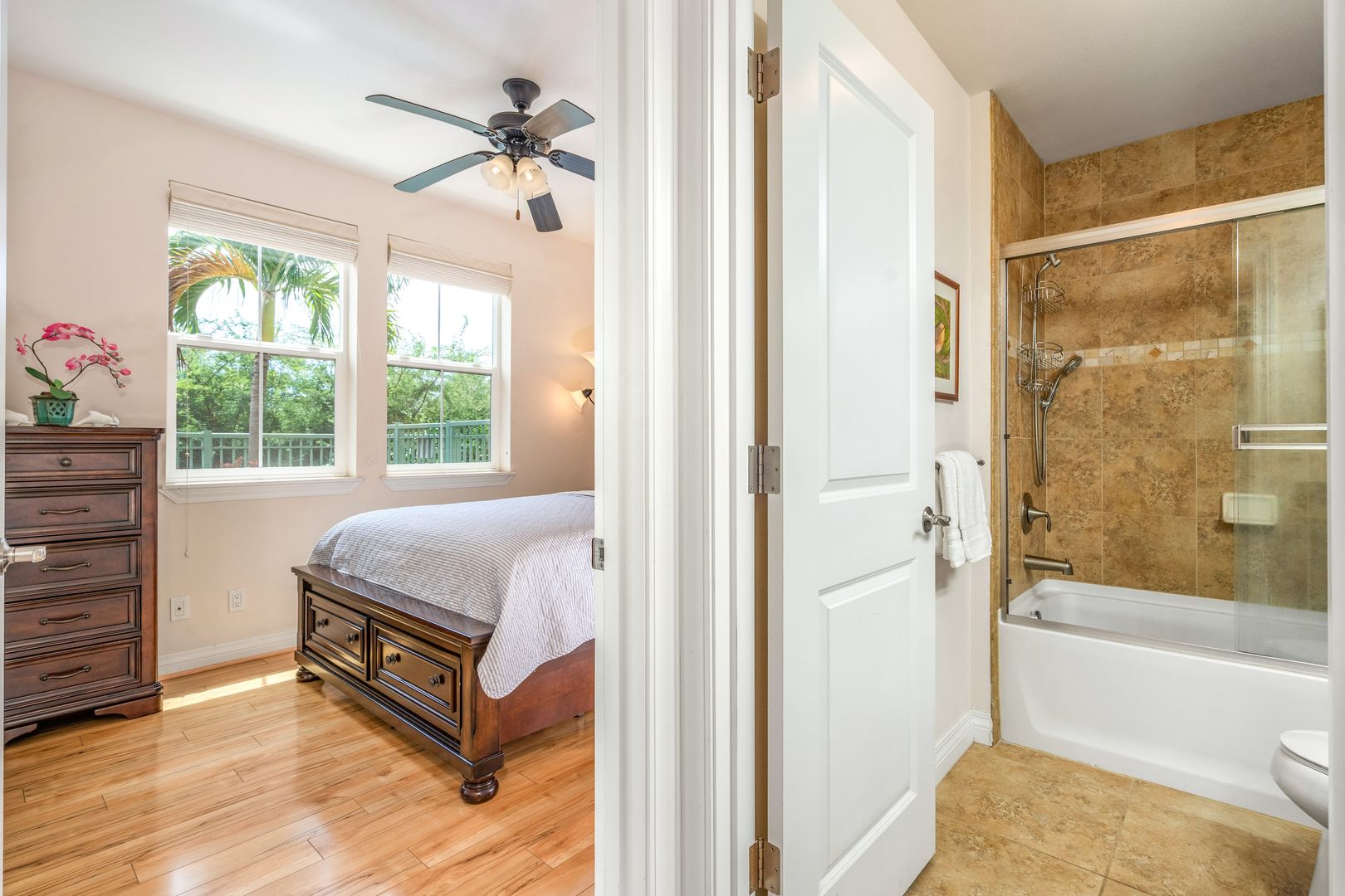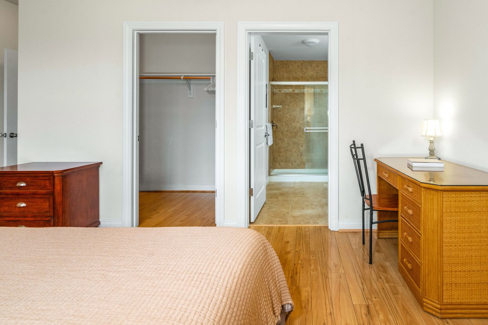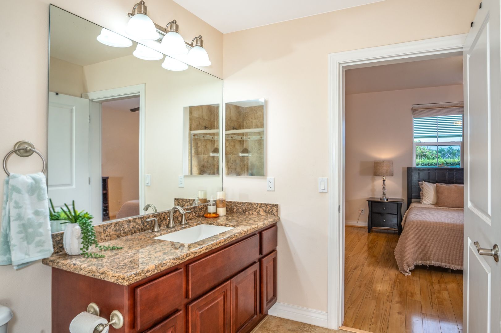 The spacious primary bedroom with a CalKing size bed and a walk in closet, an ensuite bathroom has granite countertops and a walk in shower. The second bedroom has a luxurious Queen size bed. The second bathroom off the bedroom hallway offers granite countertops and bathtub/shower combo.