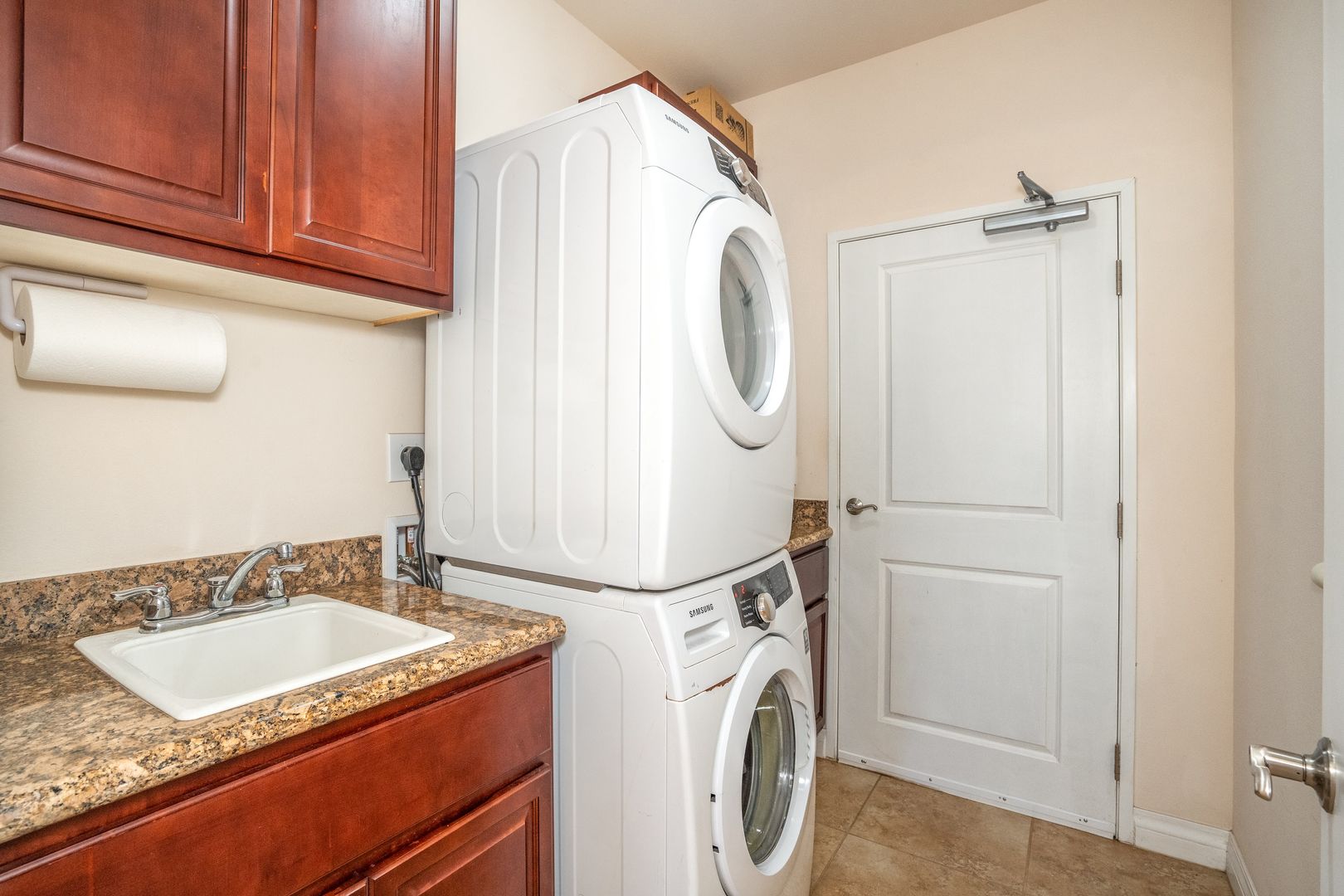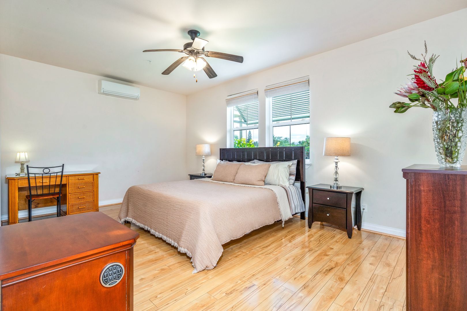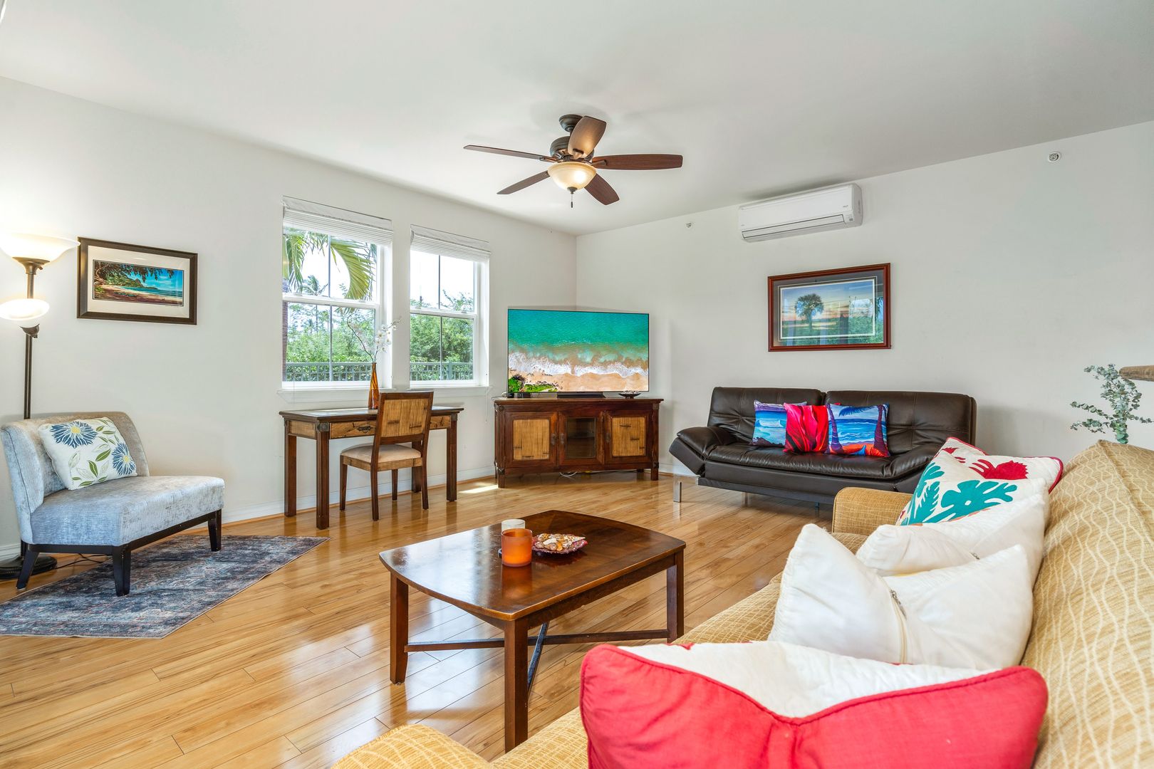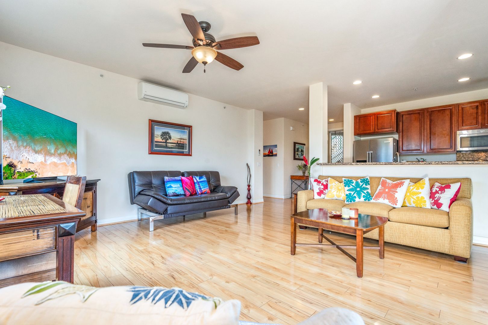 Equipped with split AC throughout the home, you'll stay cool and comfy on sunny days. The full-sized washer and dryer are conveniently located inside the home. Two assigned parking spaces.