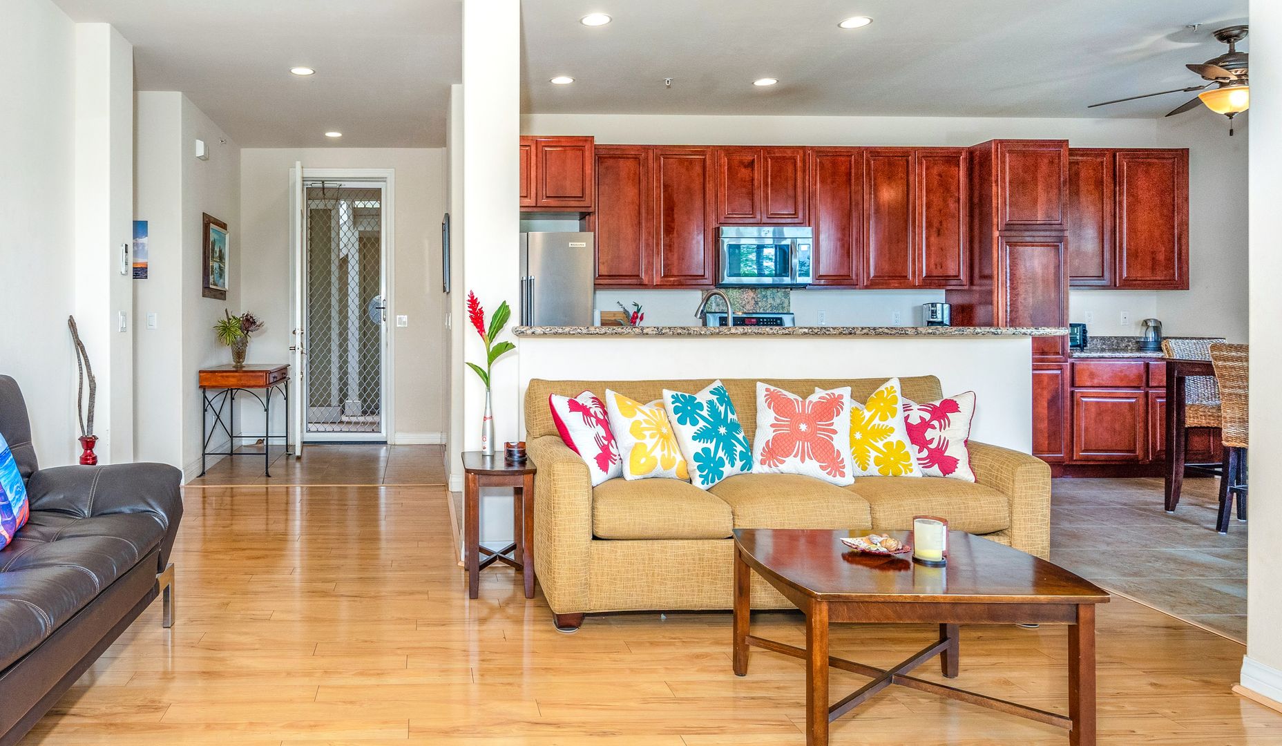The open kitchen is equipped with stainless steel appliances including a refrigerator, microwave, dishwasher, and stove. Granite countertops with rich wood cabinetry make the space a cook's dream!