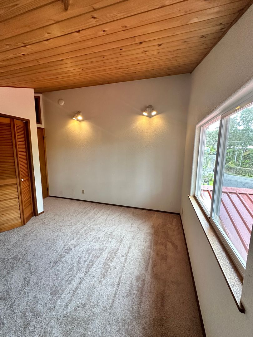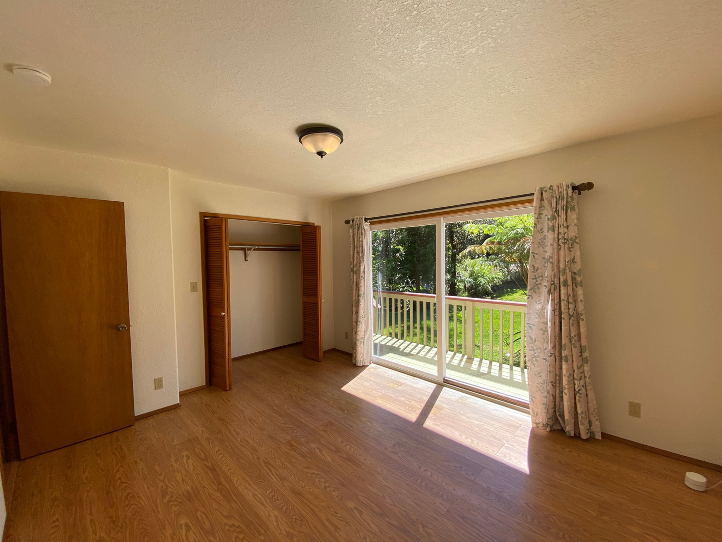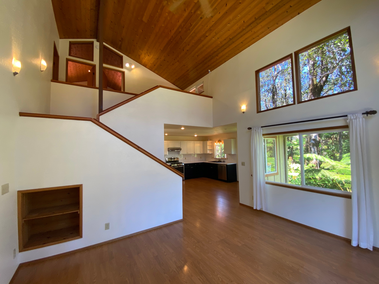 Two-story 3 bedroom, 2 bathroom home located at a cooler elevation in Volcano. Downstairs features an open kitchen, living room, one full bath and bedroom with sliding glass doors to lanai. Upstairs has two bedrooms and and the second bath. Tall ceilings and large windows make this home feel open and expansive. Dog considered with an additional pet deposit. Yard service included.